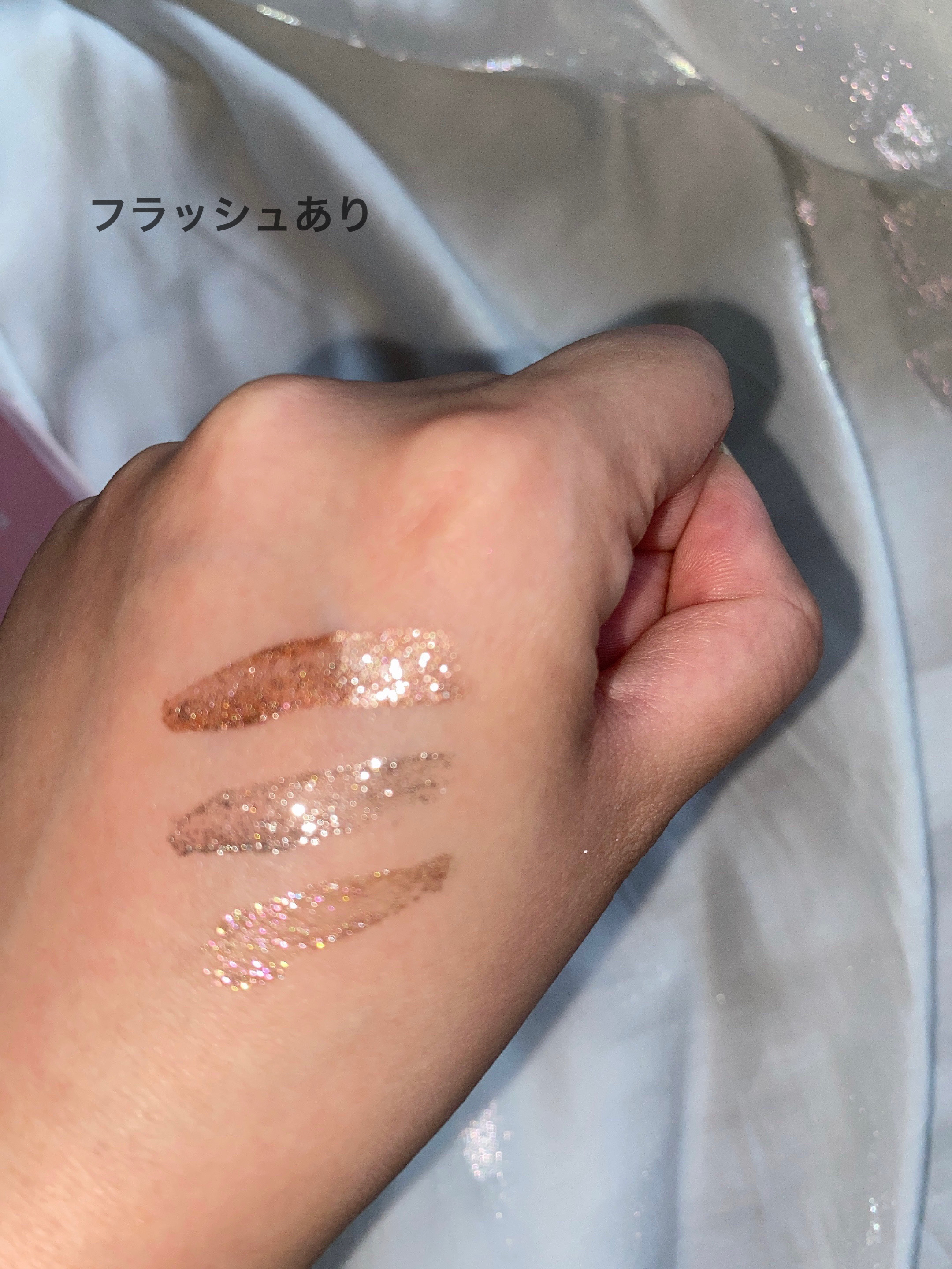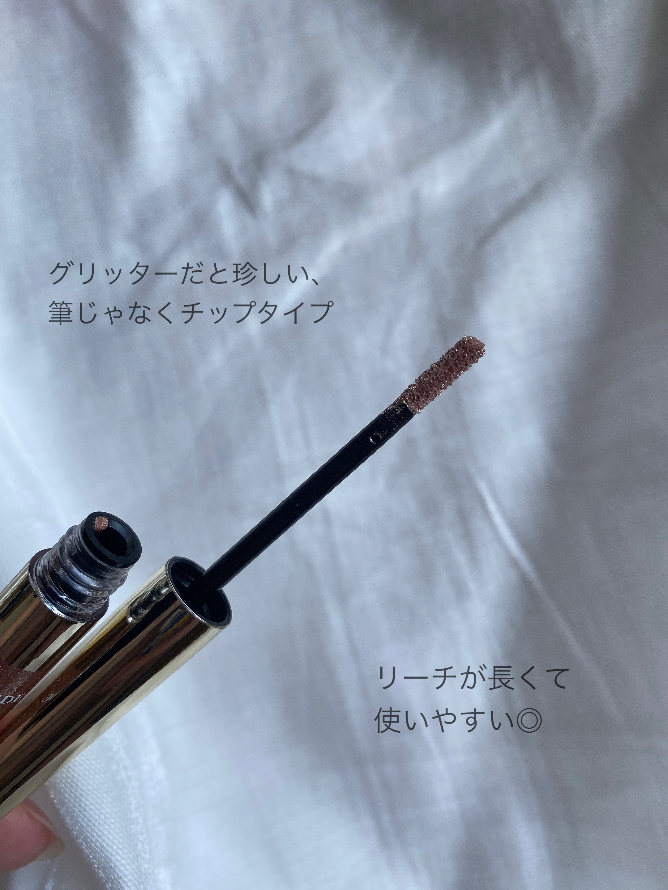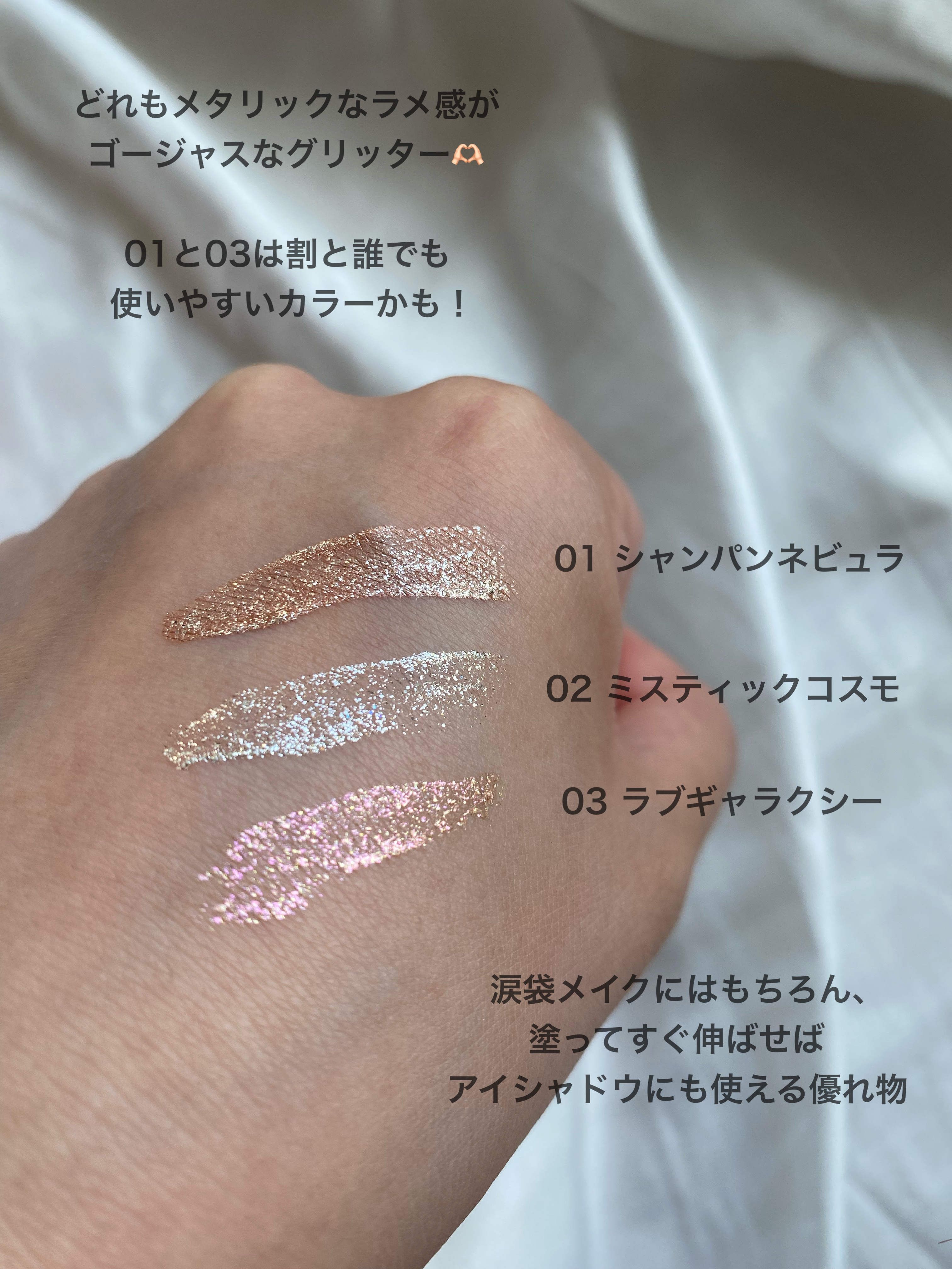 - ・星のように煌めくメタリックなホロパール ホロパールがふんだんに含まれたグリッターが星のように煌めきます。光の当たり方や角度によってグリッターの表情が変化して、目元を強調します。また3種がそれぞれ異なるパール感で、様々な印象に仕上げます。 ・塗りやすいチップでピタッと密着 細くやわらかいチップで量を調整しやすく、繊細なグリッターメイクを表現できます。 塗った瞬間肌にしっかり密着し、ポロポロ落ちにくく、煌めく発色をキープします。 <使用方法> チップに適量をとり涙袋やまぶたにのせます。指で塗りのばしてなじませます。 涙袋:アイライナーをひくように涙袋にのせます。 まぶた:アイシャドウのあとに点でまぶたにのせ、指でなじませます。 ※キャップを開封する際、液がとび散らないようにご注意ください。
