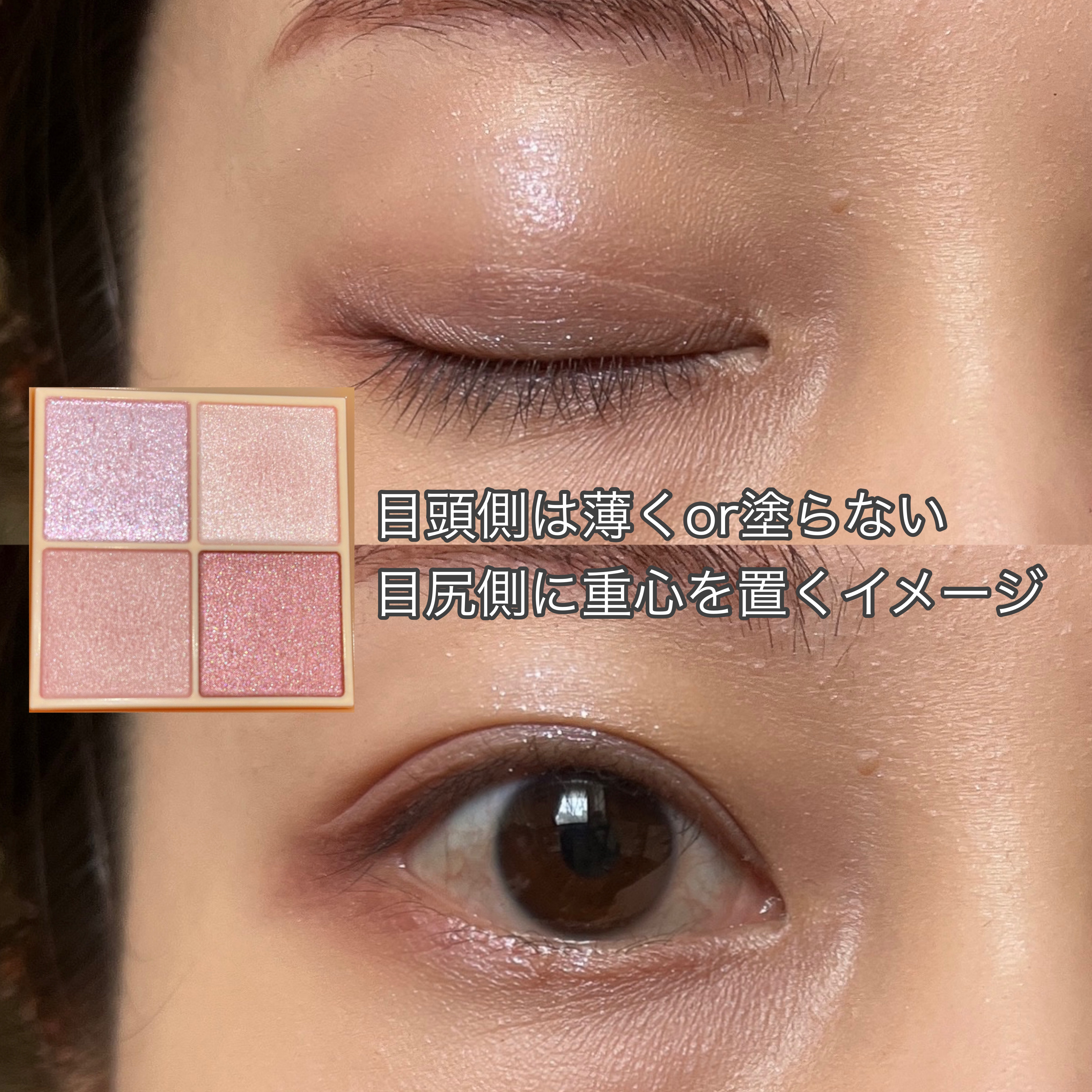- ラメ・パール・マット3質感の4色アイシャドウ。 肌馴染みの良いベージュを基調としたカラー。ラメ・パール・マットの3質感を重ねて、自然にまぶたを強調し奥行のある大きな目元へ。 しっとり溶け込むような柔らかなパウダーなので、スルスル伸びてまぶたにピタッと密着。保湿成分(スクワラン・ホホバ種子油)配合。