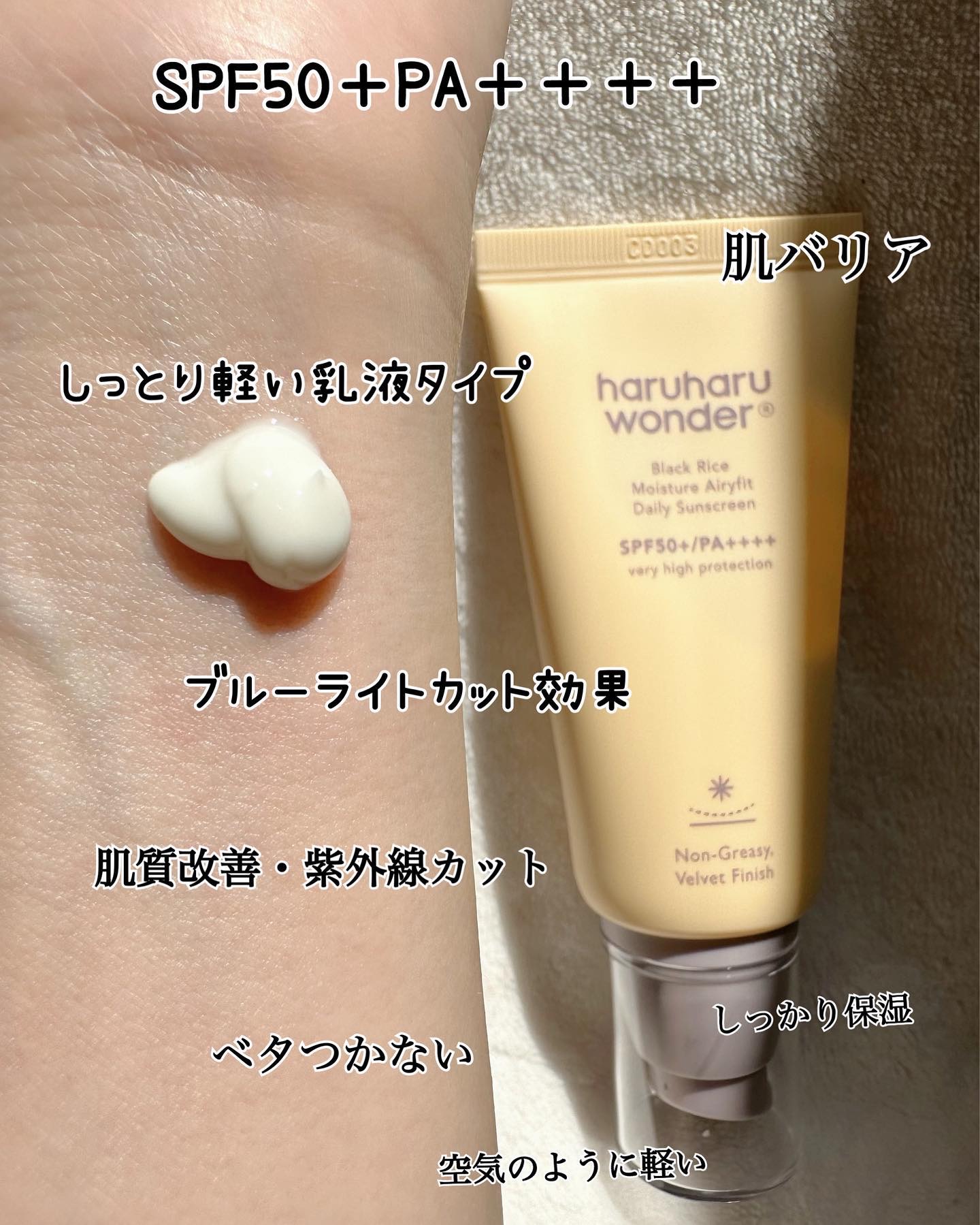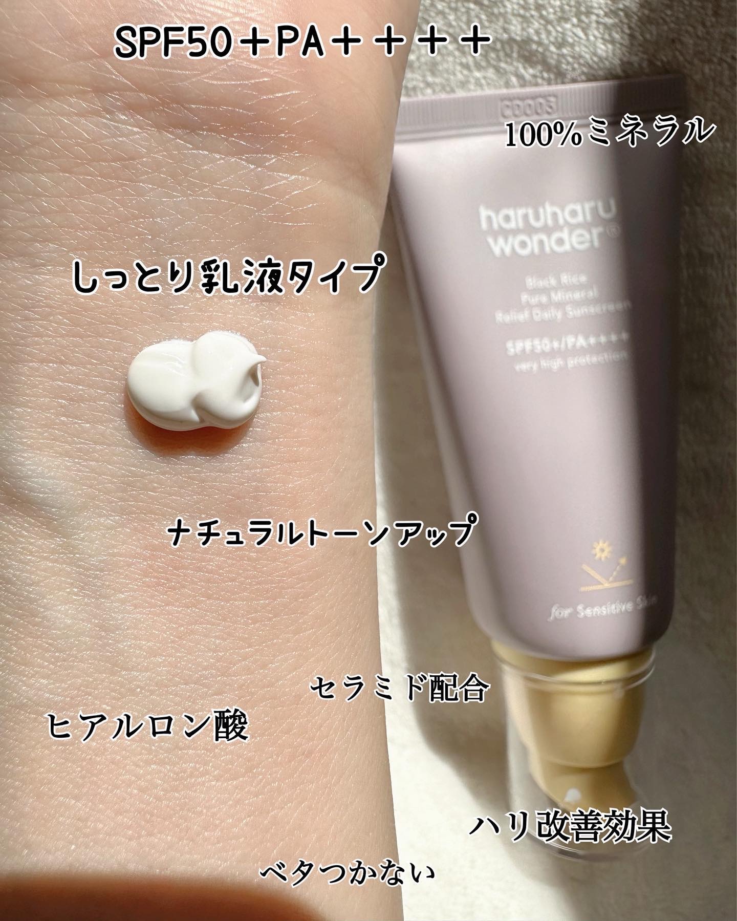 💜haruharuwonderブラックライスピュアミネラルリリーフデイリーサンスクリーン敏感肌のためのやさしい原料を使用した日焼け止め♪清らかな自然の韓国島産の黒米を100時間煎じ出したオイルインフュージョン工法の使用で有効成分の浸透率...