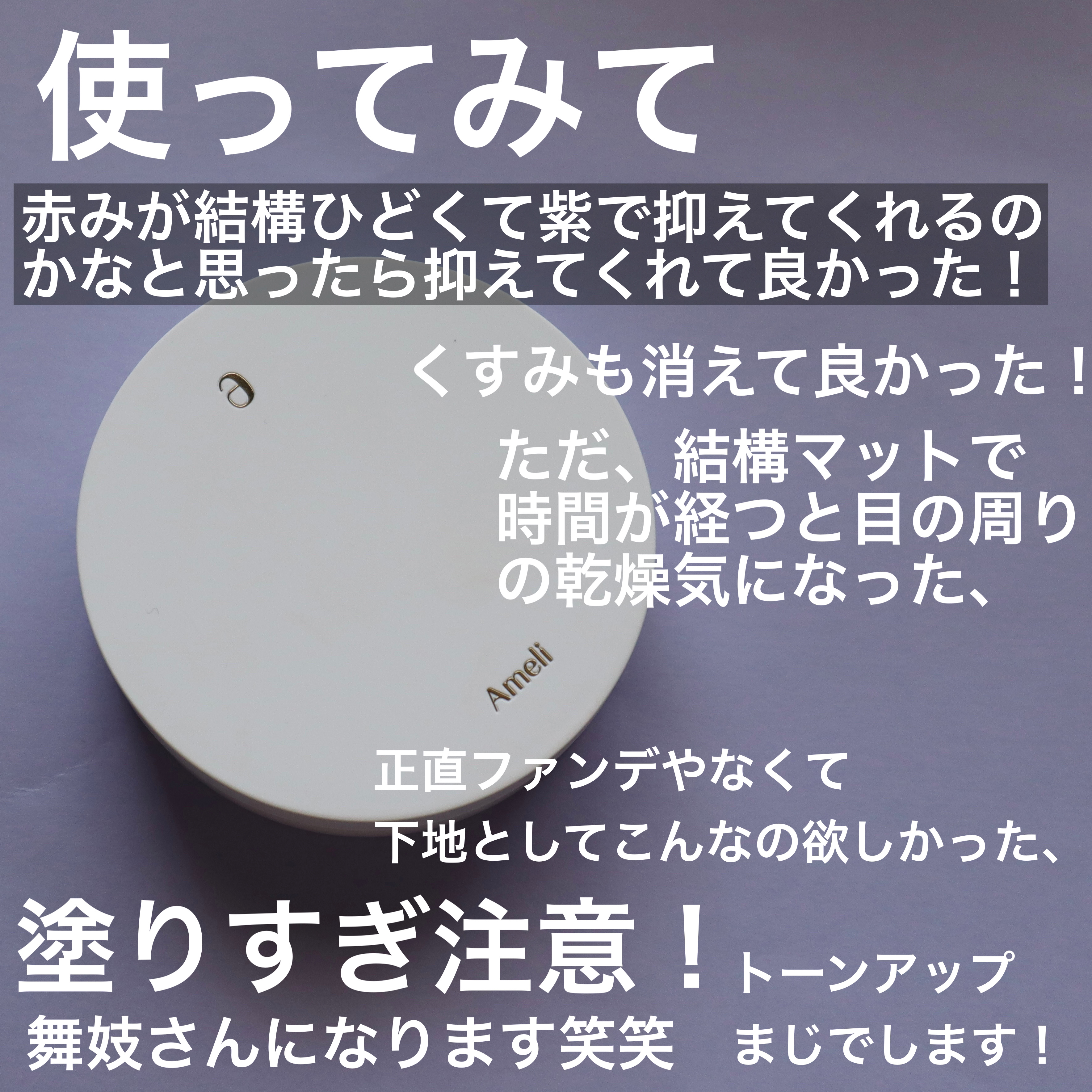 つけた直後は本当カバー力良すぎてしかも密着すぐしてくれて使いやすいなと思いました! ツヤ感もちょうどよくてすごいよかったです! マスクなしだと綺麗なまま意外とキープできるかも、、 秋冬に使うことをおすすめします。 汗に弱いなと思ったので、汗出にくい時期に! 乾燥しにくいとは言ったのですが、乾燥しにくい下地を使うと大丈夫かもです!