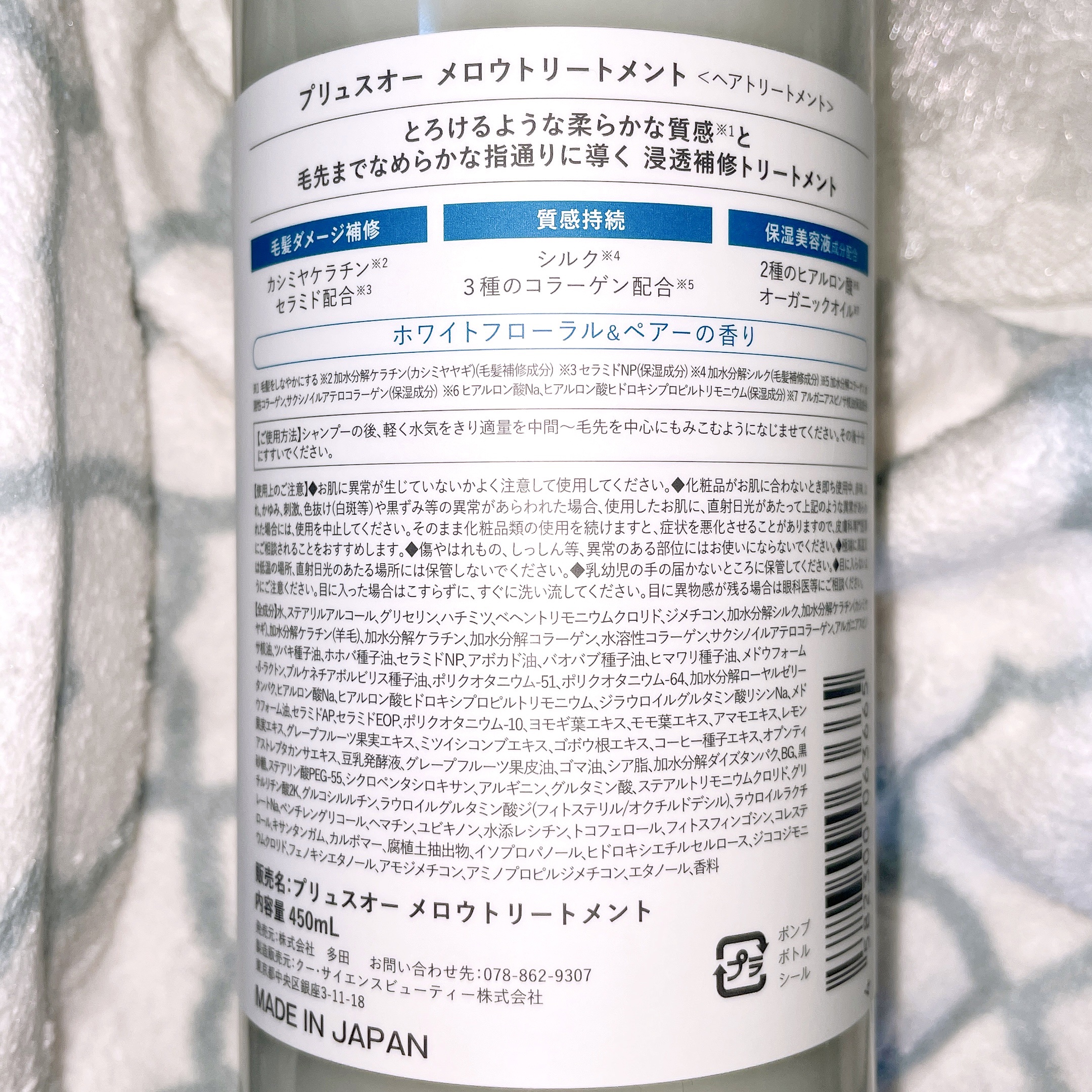 - <シャンプー 450ml> 水、ラウロイルメチルアラニンNa、コカミドDEA、コカミドプロピルベタイン、ココイルグルタミン酸Na、ココイル加水分解コラーゲンK、加水分解ケラチン(カシミヤヤギ)、加水分解ケラチン(羊毛)、加水分解シルク、オプンティアストレプタカンサエキス、異性化糖、ヘマチン、メドウフォーム-δ-ラクトン、ココイルメチルタウリンNa、ツボクサエキス、ジラウロイルグルタミン酸リシンNa、セラミドNP、アルガニアスピノサ核油、セラミドEOP、セラミドAP、ヒアルロン酸Na、ヒアルロン酸ヒドロキシプロピルトリモニウム、EDTA-2Na、加水分解ダイズタンパク、加水分解ローヤルゼリータンパク、ポリクオタニウム-10、ポリクオタニウム-7、アボカド油、バオバブ種子油、ポリクオタニウム-51、ヒマワリ種子油、ホホバ種子油、ヤシ油アルキルグルコシド、プロポリスエキス、シャクヤク根エキス、オタネニンジン根エキス、カミツレ花エキス、ハチミツ、ハチミツエキス、ローヤルゼリー、BG、ラウロイルラクチレートNa、グリセリン、ジステアリン酸PEG-150、グリチルリチン酸2K、ラウロイルグルタミン酸ジ(フィトステリル/オクチルドデシル)、トコフェロール、フィトスフィンゴシン、キサンタンガム、カルボマー、エチドロン酸、コレステロール、エチドロン酸4Na、クエン酸、メチルパラベン、エタノール、フェノキシエタノール、香料 <トリートメント 450ml> 水、ステアリルアルコール、グリセリン、ハチミツ、ベヘントリモニウムクロリド、ジメチコン、加水分解ケラチン(カシミヤヤギ)、加水分解シルク、加水分解コラーゲン、水溶性コラーゲン、サクシノイルアテロコラーゲン、加水分解ケラチン(羊毛)、加水分解ケラチン、アルガニアスピノサ核油、ツバキ種子油、ホホバ種子油、セラミドNP、アボカド油、バオバブ種子油、ヒマワリ種子油、メドウフォーム-δ-ラクトン、プルケネチアボルビリス種子油、ポリクオタニウム-51、ポリクオタニウム-64、加水分解ローヤルゼリータンパク、ヒアルロン酸Na、ヒアルロン酸ヒドロキシプロピルトリモニウム、ジラウロイルグルタミン酸リシンNa、メドウフォーム油、セラミドAP、セラミドEOP、ポリクオタニウム-10、ヨモギ葉エキス、モモ葉エキス、アマモエキス、レモン果実エキス、グレープフルーツ果実エキス、ミツイシコンプエキス、ゴボウ根エキス、コーヒー種子エキス、アプンティアストレプタカンサエキス、豆乳発酵液、グレープフルーツ果皮油、ゴマ油、シア脂、加水分解ダイズタンパク、BG、黒砂糖、ステアリン酸PEG-55、シクロベンタシロキサン、アルギニン、グルタミン酸、ステアルトリモニウムクロリド、グリチルリチン酸2K、グルコシルルチン、ラウロイウグルタミン酸ジ(フィトステリル/オクチルドデシル)、ラウロイルラクチレートNa、ベンチレングリコール、ヘマチン、ユビキノン、水添レシチン、トコフェロール、フィトスフィンゴシン、コレステロール、キサンタンガム、カルポマー、腐植土抽出物、イソプロパノール、ヒドロキシエチルセルロース、ジココジモニウムクロリド、フェノキシエタノール、アモジメチコン、アミノプロピルジメチコン、エタノール、香料 <シャンプー詰替用 350ml> 水、ラウロイルメチルアラニンNa、コカミドDEA、コカミドプロピルベタイン、ココイルグルタミン酸Na、加水分解ケラチン(カシミヤヤギ)、加水分解ケラチン(羊毛)、加水分解シルク、ココイル加水分解コラーゲンK、オプンティアストレプタカンサエキス、異性化糖、ヘマチン、メドウフォーム-δ-ラクトン、ココイルメチルタウリンNa、ツボクサエキス、ジラウロイルグルタミン酸リシンNa、セラミドNP、アルガニアスピノサ核油、セラミドEOP、セラミドAP、ヒアルロン酸Na、ヒアルロン酸ヒドロキシプロピルトリモニウム、EDTA-2Na、加水分解ダイズタンパク、加水分解ローヤルゼリータンパク、ポリクオタニウム-10、ポリクオタニウム-7、アボカド油、バオバブ種子油、ポリクオタニウム-51、ヒマワリ種子油、ホホバ種子油、ヤシ油アルキルグルコシド、プロポリスエキス、シャクヤク根エキス、オタネニンジン根エキス、カミツレ花エキス、ハチミツ、ハチミツエキス、ローヤルゼリー、BG、ラウロイウラクチレートNa、グリセリン、ジステアリン酸PEG-150、グリチルリチン酸2K、ラウロイルグルタミン酸ジ(フィトステリル/オクチルドデシル)、トコフェロール、フィトスフィンゴシン、キサンタンガム、カルポマー、エチドロン酸、コレステロール、エチドロン酸4Na、クエン酸、メチルパラベン、エタノール、フェノキシエタノール、香料 <トリートメント詰替用 350ml> 水、ステアリルアルコール、グリセリン、ハチミツ、ベヘントリモニウムクロリド、ジメチコン、加水分解シルク、加水分解ケラチン(カシミヤヤギ)、加水分解ケラチン(羊毛)、加水分解ケラチン、加水分解コラーゲン、水溶性コラーゲン、サクシノイルアテロコラーゲン、アルガニアスピノ