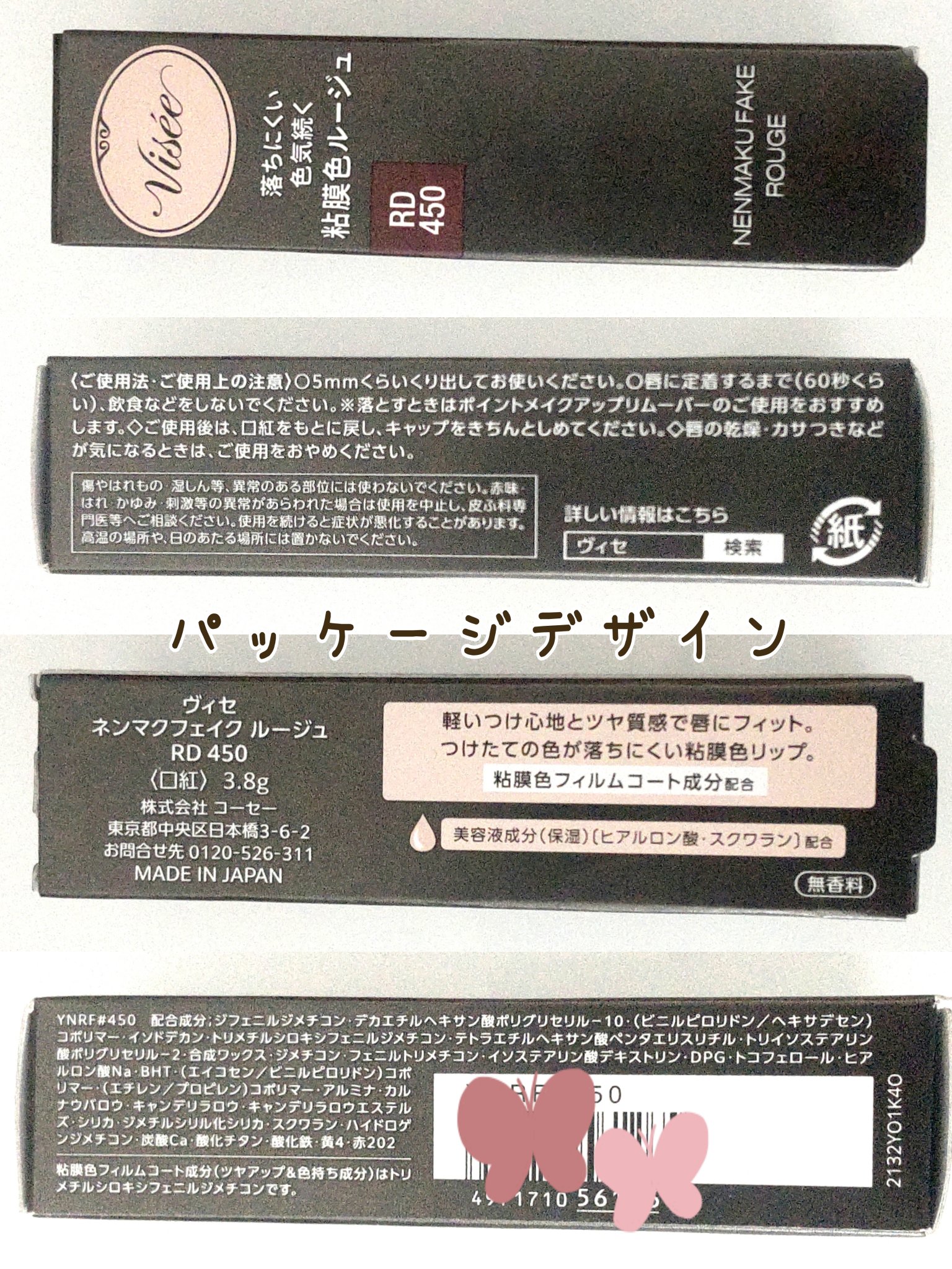 - <BE351 桃のはにかみ> ジフェニルジメチコン、デカエチルヘキサン酸ポリグリセリル-10、(VP/ヘキサデセン)コポリマー、イソドデカン、トリメチルシロキシフェニルジメチコン、テトラエチルヘキサン酸ペンタエリスリチル、トリイソステアリン酸ポリグリセリル-2、合成ワックス、ジメチコン、フェニルトリメチコン、イソステアリン酸デキストリン、DPG、トコフェロール、ヒアルロン酸Na、BHT、(エイコセン/ビニルピロリドン)コポリマー、(エチレン/プロピレン)コポリマー、カルナウバロウ、キャンデリラロウ、キャンデリラロウエステルズ、ジメチルシリル化シリカ、スクワラン、トリイソステアリン酸イソプロピルチタン、ハイドロゲンジメチコン、メチコン、水酸化Al、炭酸Ca、酸化チタン、酸化鉄、黄4、赤202 <BR350 林檎の口づけ> ジフェニルジメチコン、デカエチルヘキサン酸ポリグリセリル-10、(ビニルピロリドン/ヘキサデセン)コポリマー、イソドデカン、トリメチルシロキシフェニルジメチコン、テトラエチルヘキサン酸ペンタエリスリチル、トリイソステアリン酸ポリグリセリル-2、合成ワックス、ジメチコン、フェニルトリメチコン、イソステアリン酸デキストリン、DPG、トコフェロール、ヒアルロン酸Na、BHT、(エイコセン/ビニルピロリドン)コポリマー、(エチレン/プロピレン)コポリマー、アルミナ、カルナウバロウ、キャンデリラロウ、キャンデリラロウエステルズ、シリカ、ジメチルシリル化シリカ、スクワラン、ハイドロゲンジメチコン、炭酸Ca、酸化チタン、酸化鉄、黄4、赤202 <BR352 駆け引きワイン(限定)> ジフェニルジメチコン、デカエチルヘキサン酸ポリグリセリル-10、(VP/ヘキサデセン)コポリマー、イソドデカン、トリメチルシロキシフェニルジメチコン、テトラエチルヘキサン酸ペンタエリスリチル、合成ワックス、ジメチコン、フェニルトリメチコン、トリイソステアリン酸ポリグリセリル-2、イソステアリン酸デキストリン、DPG、トコフェロール、ヒアルロン酸Na、BHT、(エイコセン/ビニルピロリドン)コポリマー、(エチレン/プロピレン)コポリマー、アルミナ、カルナウバロウ、キャンデリラロウ、キャンデリラロウエステルズ、シリカ、ジメチルシリル化シリカ、スクワラン、ハイドロゲンジメチコン、炭酸Ca、酸化チタン、酸化鉄、黄4、赤202 <OR250 海星の恋心> ジフェニルジメチコン、デカエチルヘキサン酸ポリグリセリル-10、(ビニルピロリドン/ヘキサデセン)コポリマー、イソドデカン、トリメチルシロキシフェニルジメチコン、トリイソステアリン酸ポリグリセリル-2、テトラエチルヘキサン酸ペンタエリスリチル、合成ワックス、ジメチコン、フェニルトリメチコン、イソステアリン酸デキストリン、DPG、トコフェロール、ヒアルロン酸Na、BHT、(エイコセン/ビニルピロリドン)コポリマー、(エチレン/プロピレン)コポリマー、アルミナ、カルナウバロウ、キャンデリラロウ、キャンデリラロウエステルズ、シリカ、ジメチルシリル化シリカ、スクワラン、ハイドロゲンジメチコン、炭酸Ca、酸化チタン、酸化鉄、黄4、赤202 <PK850 うさぎの恋人> ジフェニルジメチコン、デカエチルヘキサン酸ポリグリセリル-10、(ビニルピロリドン/ヘキサデセン)コポリマー、イソドデカン、トリメチルシロキシフェニルジメチコン、テトラエチルヘキサン酸ペンタエリスリチル、トリイソステアリン酸ポリグリセリル-2、合成ワックス、ジメチコン、フェニルトリメチコン、イソステアリン酸デキストリン、DPG、トコフェロール、ヒアルロン酸Na、BHT、(エイコセン/ビニルピロリドン)コポリマー、(エチレン/プロピレン)コポリマー、アルミナ、カルナウバロウ、キャンデリラロウ、キャンデリラロウエステルズ、シリカ、ジメチルシリル化シリカ、スクワラン、ハイドロゲンジメチコン、炭酸Ca、酸化チタン、酸化鉄、黄4、赤202 <PK851 わがままな肉球> ジフェニルジメチコン、デカエチルヘキサン酸ポリグリセリル-10、(ビニルピロリドン/ヘキサデセン)コポリマー、イソドデカン、トリメチルシロキシフェニルジメチコン、テトラエチルヘキサン酸ペンタエリスリチル、トリイソステアリン酸ポリグリセリル-2、合成ワックス、ジメチコン、フェニルトリメチコン、イソステアリン酸デキストリン、DPG、トコフェロール、ヒアルロン酸Na、BHT、(エイコセン/ビニルピロリドン)コポリマー、(エチレン/プロピレン)コポリマー、アルミナ、カルナウバロウ、キャンデリラロウ、キャンデリラロウエステルズ、シリカ、ジメチルシリル化シリカ、スクワラン、ハイドロゲンジメチコン、炭酸Ca、酸化チタン、酸化鉄、黄4、赤202 <PK852 桜の微笑み> ジフェニルジメチコン、デカエチルヘキサン酸ポリグリセリル-10、(VP/ヘキサデセン)コポリマー、イソドデカン、トリメチルシロキシフェニルジメチコン、テトラエチルヘキサン酸ペンタエリスリチル、合成ワックス、トリイソステアリン酸ポリグリセリル-2、ジメチコン、フェニルトリメ