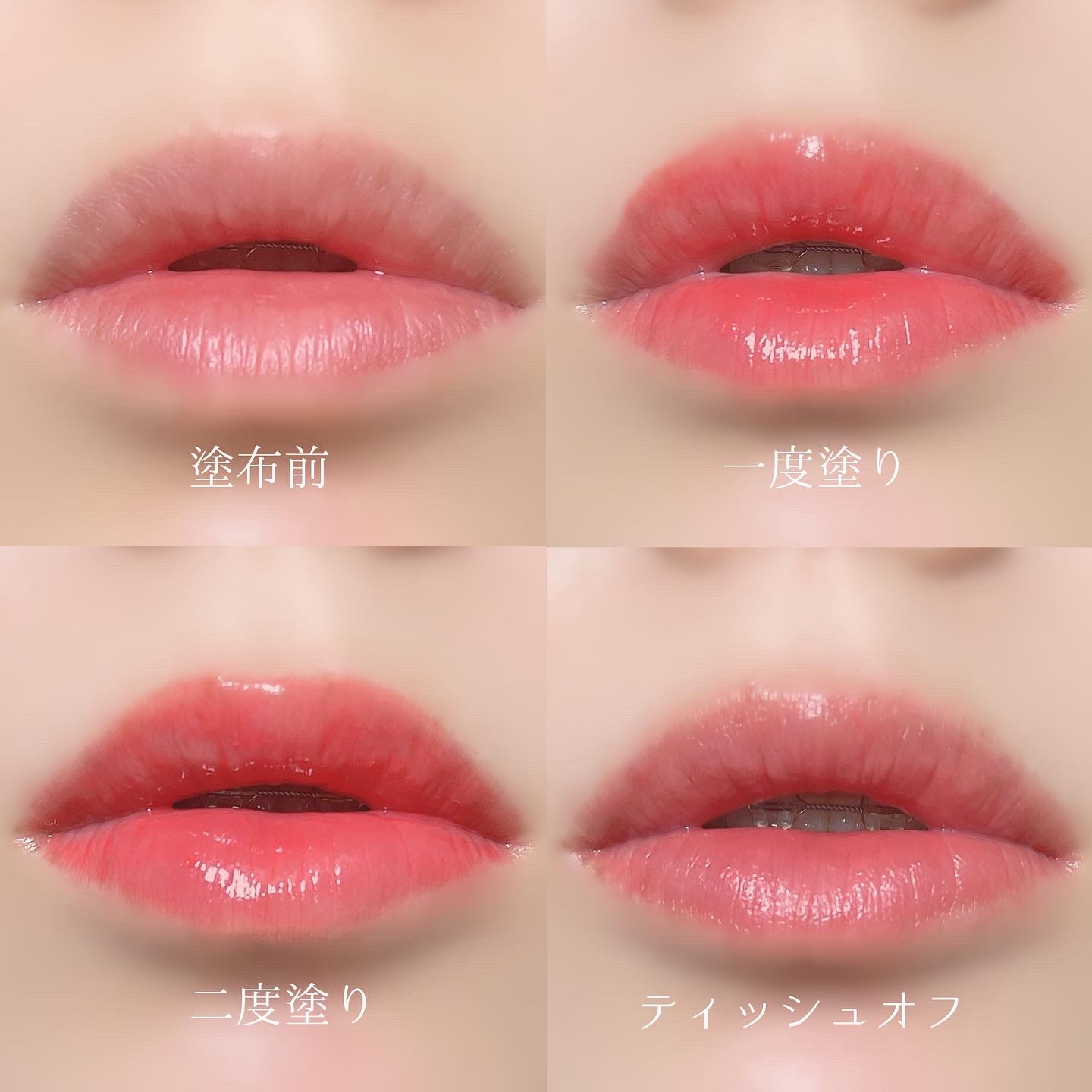 なめらかなつけ心地と落ちにくさすごい✨ ツヤっとしていて透明感もあり☺️ 膜を薄く張ったようなしっとり感で、 塗ってから60秒ほど待ち、 ティッシュオフしてもそのしっとり感は 残っている印象🌼 さらに色移りしにくい仕上がりでした🤍 食べたり飲んだりした時もフチだけ 色残り現象は特になかったです🌱 肌なじみのいいコーラルピンク💕 青みがかわいいモーヴピンクカラー💕 ほどよいテラコッタオレンジ系カラー🧡 青みのあるチェリーレッドカラー🌹 ブラウンレッド系のカラー🤎 ディープレッドカラー🥀