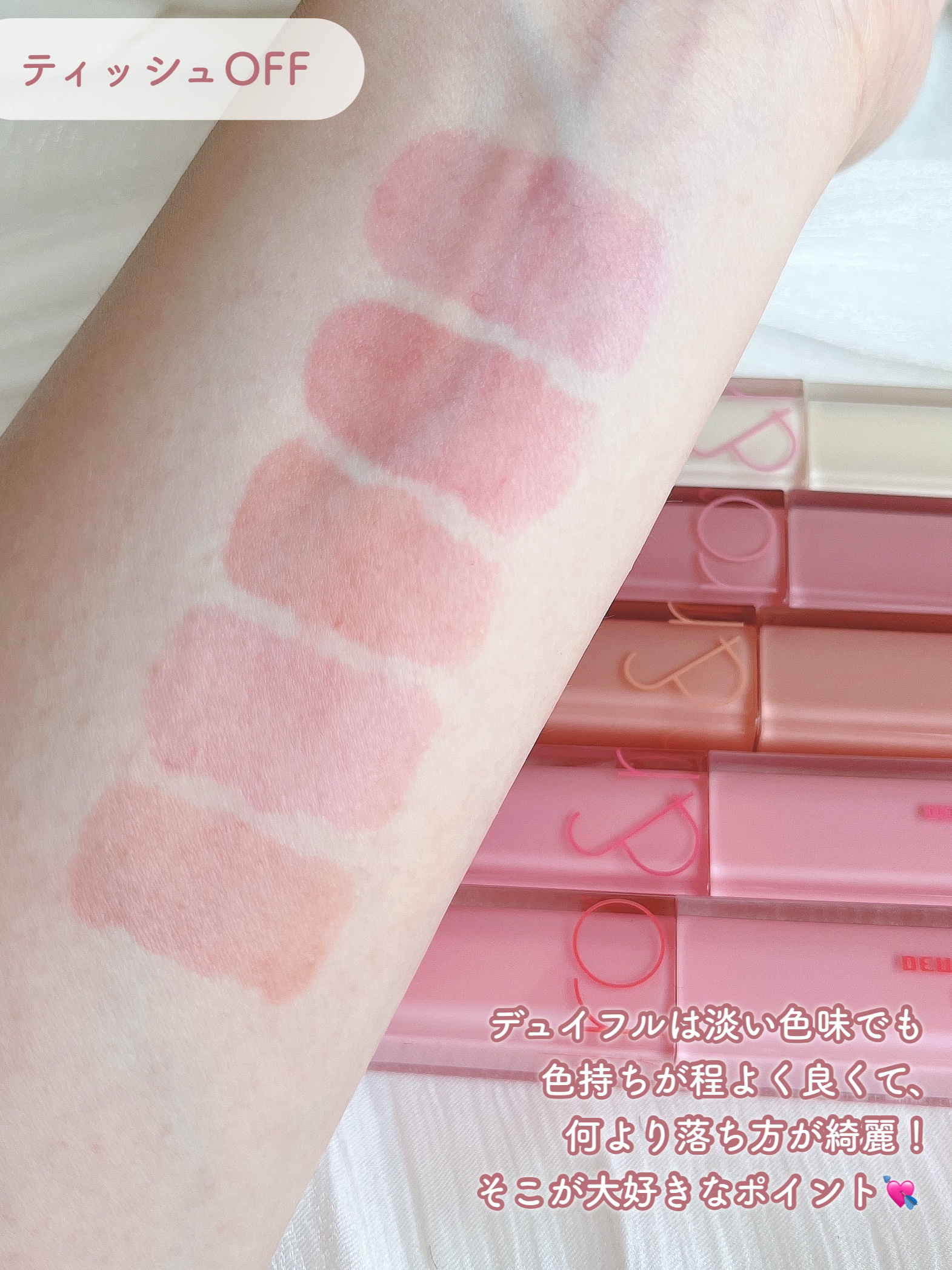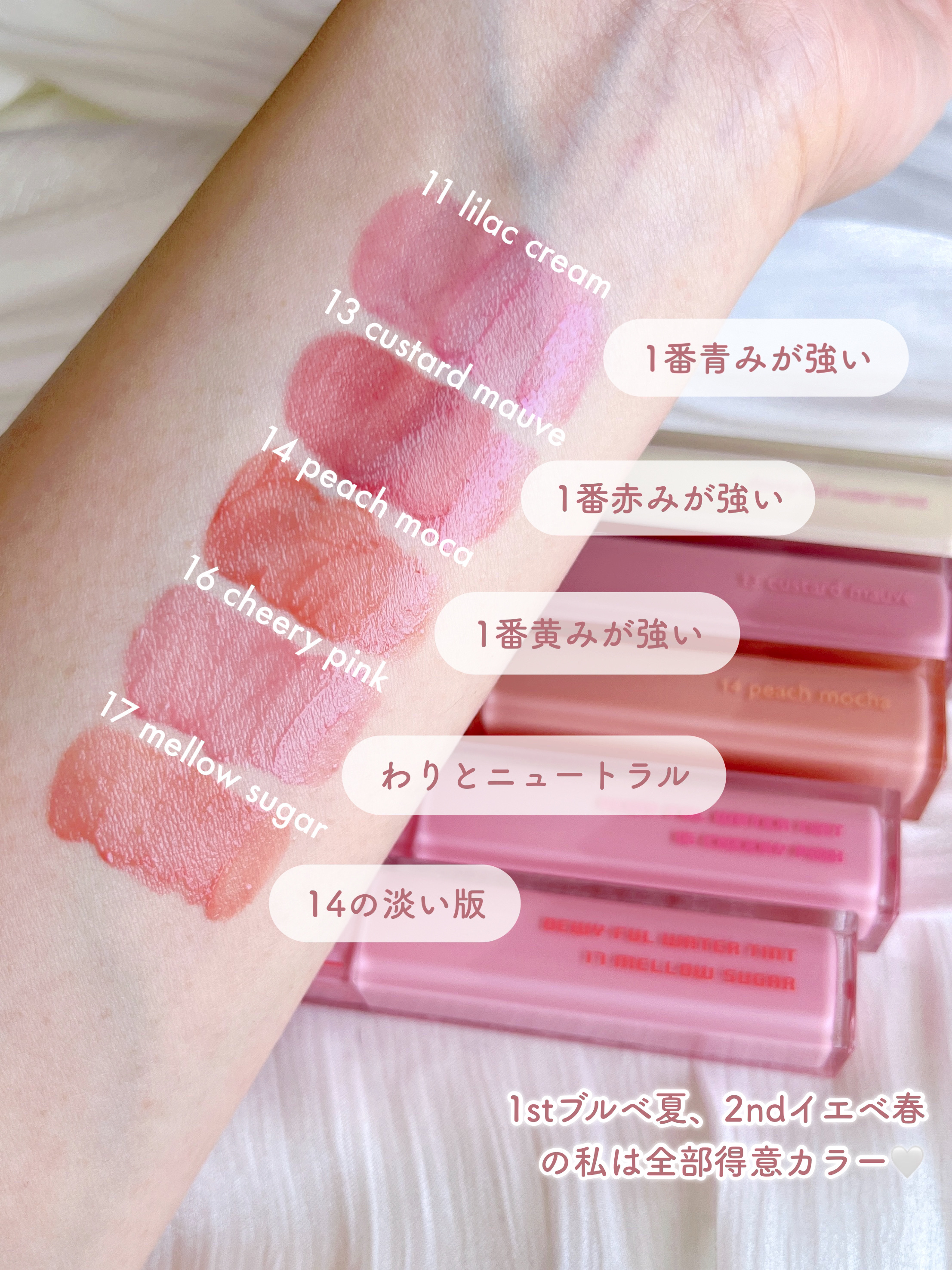 私的に、色持ちの他に'落ち方が綺麗か'もかなり重要視しています🤔 オフィスメイクにも、デートにも、毎日メイクにも使いやすいラインナップです🫰🏻 ブルベのイエベ寄せメイクにも💯