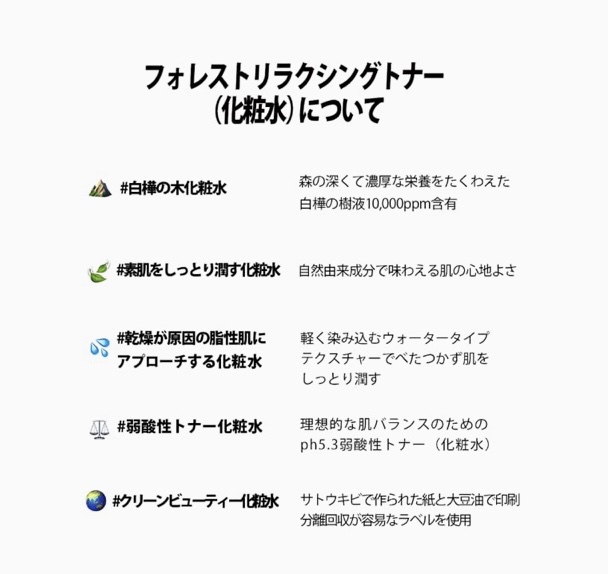 肌バランスのための、ph5.3弱酸性トナー🥰 濃厚な栄養を含む白樺樹液を配合し、脂性肌にアプローチ✨ 軽く染み込むテクスチャーでべたつかず肌をしっとり潤します!! サッパリとしたつけ心地🙆🏻♀️ 環境に配慮されたパッケージで、ラベルも剥がしやすい🌱 とろみがあるのに、みずみずしいテクスチャー🌿 自然由来成分で、優しいケアを!! さっぱり系なので春・夏向きかな…?💦(冬は保湿が足りなそう…)