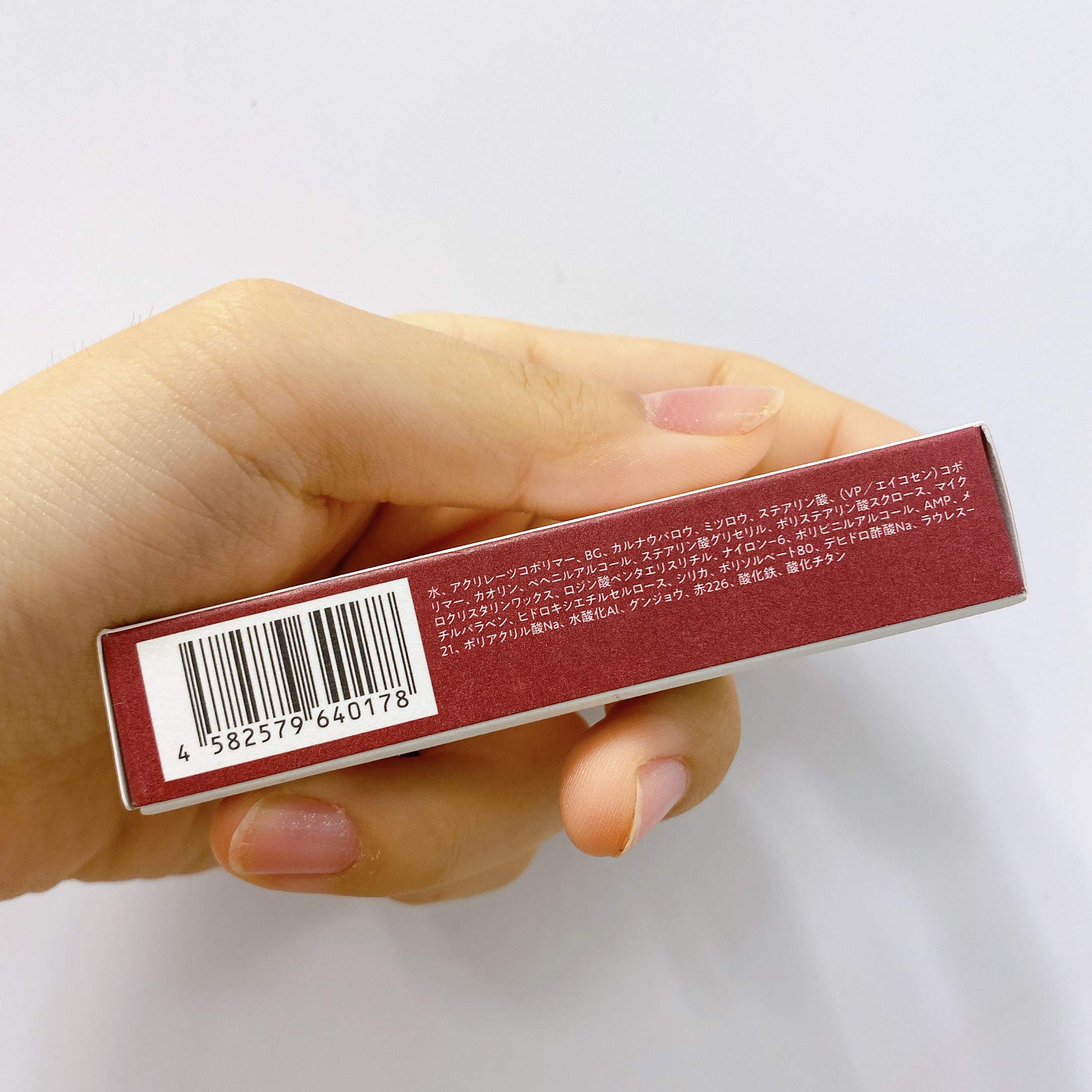 - <01 バーガンディ> 水、アクリレーツコポリマー、BG、カルナウバロウ、ミツロウ、ステアリン酸、(VP/エイコセン)コポリマー、カオリン、ベヘニルアルコール、ステアリン酸グリセリル、ポリステアリン酸スクロース、マイクロクリスタリンワックス、ロジン酸ペンタエリスリチル、ナイロン-6、水酸化Al、ポリビニルアルコール、AMP、メチルパラベン、ヒドロキシエチルセルロース、シリカ、ポリソルベート80、デヒドロ酢酸Na、ラウレス-21、ポリアクリル酸Na、グンジョウ、赤226、酸化鉄、酸化チタン <02 テラコッタ> 水、アクリレーツコポリマー、BG、カルナウバロウ、ミツロウ、ステアリン酸、ステアリン酸グリセリル、(VP/エイコセン)コポリマー、ポリステアリン酸スクロース、ベヘニルアルコール、ロジン酸グリセリル、ナイロン-6、マイクロクリスタリンワックス、シリカ、AMP、メチルパラベン、ヒドロキシエチルセルロース、ポリソルベート80、ポリビニルアルコール、デヒドロ酢酸Na、カオリン、ラウレス-21、ポリアクリル酸Na、酸化鉄、酸化チタン <03 グリッターブラウン> 水、アクリレーツコポリマー、BG、ミツロウ、カルナウバロウ、ステアリン酸、(VP/エイコセン)コポリマー、カオリン、ステアリン酸グリセリル、ポリステアリン酸スクロース、マイクロクリスタリンワックス、ロジン酸ペンタエリスリチル、ナイロン-6、ベヘニルアルコール、シリカ、AMP、ポリビニルアルコール、メチルパラベン、ヒドロキシエチルセルロース、ポリソルベート80、デヒドロ酢酸Na、ラウレス-21、ポリアクリル酸Na、マイカ、酸化チタン、酸化鉄 <04 モスグリーン> 水、アクリレーツコポリマー、BG、カルナウバロウ、ミツロウ、ステアリン酸、(VP/エイコセン)コポリマー、ステアリン酸グリセリル、ポリステアリン酸スクロース、マイクロクリスタリンワックス、ベヘニルアルコール、ロジン酸ペンタエリスリチル、カオリン、ナイロン-6、ポリビニルアルコール、AMP、ポリソルベート80、メチルパラベン、ヒドロキシエチルセルロース、シリカ、デヒドロ酢酸Na、ラウレス-21、ポリアクリル酸Na、水酸化クロム、グンジョウ、酸化鉄、酸化チタン <05 ダイアモンド> 水、エタノール、アクリレーツコポリマー、BG、水酸化Na、フェノキシエタノール、メチルパラベン、ヒドロキシエチルセルロース、(PET/Al)ラミネート、合成金雲母、酸化チタン <08 ライトベージュ> 水、アクリレーツコポリマー、BG、カルナウバロウ、ミツロウ、ステアリン酸、(VP/エイコセン)コポリマー、ステアリン酸グリセリル、ポリステアリン酸スクロース、マイクロクリスタリンワックス、ベヘニルアルコール、ロジン酸ペンタエリスリチル、ナイロン-6、AMP、メチルパラベン、ポリビニルアルコール、ヒドロキシエチルセルロース、ポリソルベート80、デヒドロ酢酸Na、シリカ、カオリン、ラウレス-21、ポリアクリル酸Na、酸化チタン、酸化鉄、水酸化Al <09 モーヴピンク> 水、アクリレーツコポリマー、BG、カルナウバロウ、ミツロウ、ステアリン酸、(VP/エイコセン)コポリマー、ステアリン酸グリセリル、ポリステアリン酸スクロース、マイクロクリスタリンワックス、ベヘニルアルコール、ロジン酸グリセリル、ナイロン-6、AMP、メチルパラベン、ポリビニルアルコール、ヒドロキシエチルセルロース、ポリソルベート80、デヒドロ酢酸Na、シリカ、カオリン、ラウレス-21、ポリアクリル酸Na、酸化鉄、酸化チタン、水酸化Al、赤226、グンジョウ <10 チョコレートブラウン> 水、アクリレーツコポリマー、BG、カルナウバロウ、ミツロウ、ステアリン酸、ステアリン酸グリセリル、(VP/エイコセン)コポリマー、ポリステアリン酸スクロース、ベヘニルアルコール、ロジン酸グリセリル、ナイロン-6、マイクロクリスタリンワックス、シリカ、AMP、メチルパラベン、ヒドロキシエチルセルロース、ポリソルベート80、ポリビニルアルコール、デヒドロ酢酸Na、カオリン、ラウレス-21、ポリアクリル酸Na、酸化鉄、酸化チタン <11 メタリックラベンダー> 水、BG、アクリレーツコポリマー、カルナウバロウ、ミツロウ、ステアリン酸、ベヘニルアルコール、ステアリン酸グリセリル、(VP/エイコセン)コポリマー、ポリステアリン酸スクロース、マイクロクリスタリンワックス、ロジン酸グリセリル、シリカ、AMP、メチルパラベン、ナイロン-6、ヒドロキシエチルセルロース、ポリソルベート80、ポリビニルアルコール、カオリン、ポリアクリル酸Na、デヒドロ酢酸Na、ラウレス-21、酸化鉄、マイカ、ホウケイ酸(Ca/Al)、酸化チタン、水酸化Al、赤226、酸化スズ <12 シアーダークネイビー> 水、アクリレーツコポリマー、BG、カルナウバロウ、ミツロウ、ステアリン酸、ステアリン酸グリセリル、(VP/エイコセン)コポリマー、ポリステアリン酸スクロース、ベヘニルアルコール、ロジン酸グリセリル、ナイロン-6、マイクロクリスタリンワックス、シリカ、AMP、メチルパラベン、ヒドロキシエチルセルロ