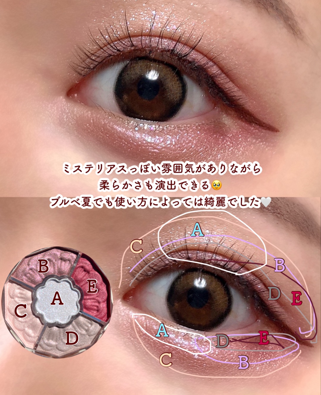 コレはモテ確定のアイシャドウと私の中で決定した 左上: 偏光パールがチラつく珍しいピンクカラー 右上:ホワイトやピンクのラメが煌めくカラー 真ん中: 柔らかいパール入りのベージュ 左下:シアーな赤。少し温かみのあるコーラル感も感じます 右下:マットカラーの赤みのあるブラウン これはね、動画でも伝わらないぐらいラメが繊細で可愛いんだよね😍 女の子らしさが溢れんばかりの儚げピンク💗