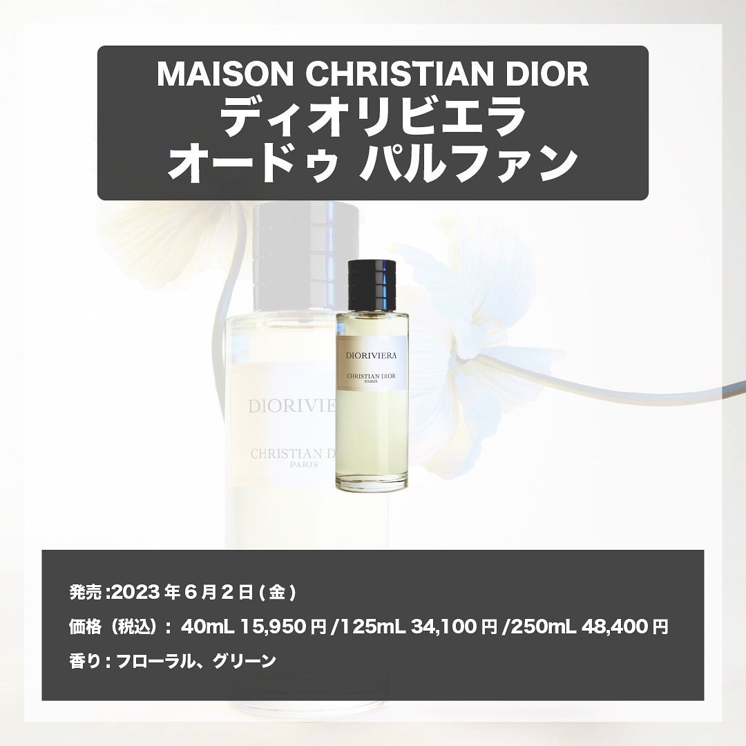 . 『薔薇由来 新作香水』 🌳製品情報🌳 MAISON CHRISTIAN DIOR ディオリビエラ オードゥ パルファン 発売:2023年6月2日(金) 価格(税込): 40mL 15,950円/125mL 34,100円/250mL 48,400円 香り: フローラル、グリーン 🌳コメント🌳 ・ローズとイチジクのフルーティーな香りをメインに、グリーンやフローラルを加え、太陽の温もりを感じるなめらかな香りに。南フランスの情景が浮かびあがるような、自然と気分を明るくさせてくれる魅力的なフレグランスに仕上げている。 引用:MAISON CHRISTIAN DIOR公式HP 🍃===================================🍃 #香水 #フレグランス #フレグランスミスト #フレグランスハーバリウム #プレゼントにおすすめ #プレゼント選び #プレゼントに最適 #香水好きな人と繋がりたい #香水マニア #香水好き #香りフェチ #香り好きな人と繋がりたい #香り #モテる #モテる方法 #新作 #春の新作 #花見 #夏の新作 #オードパルファム #オードパルファン #ディオール #Dior #薔薇 #バラ #ばら
