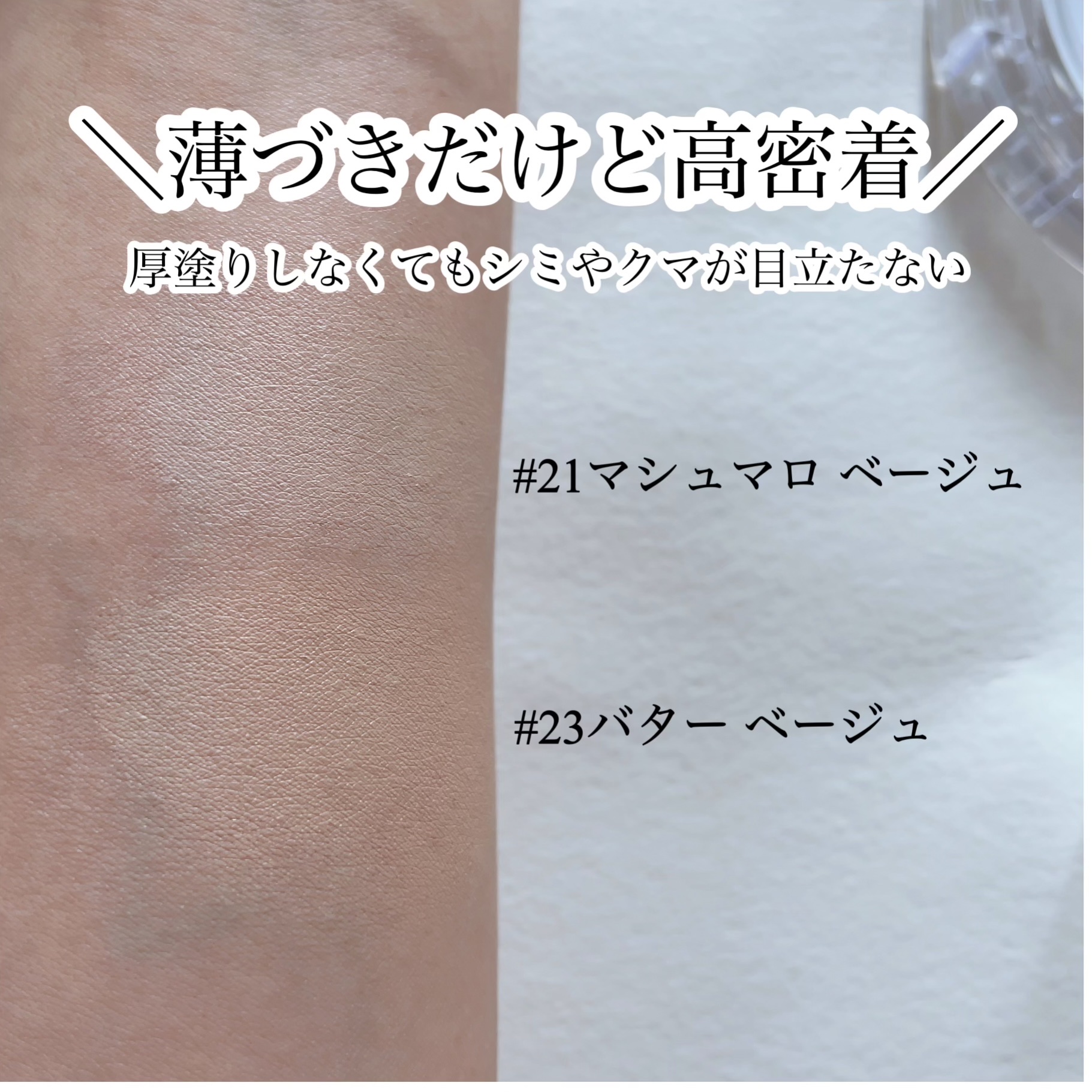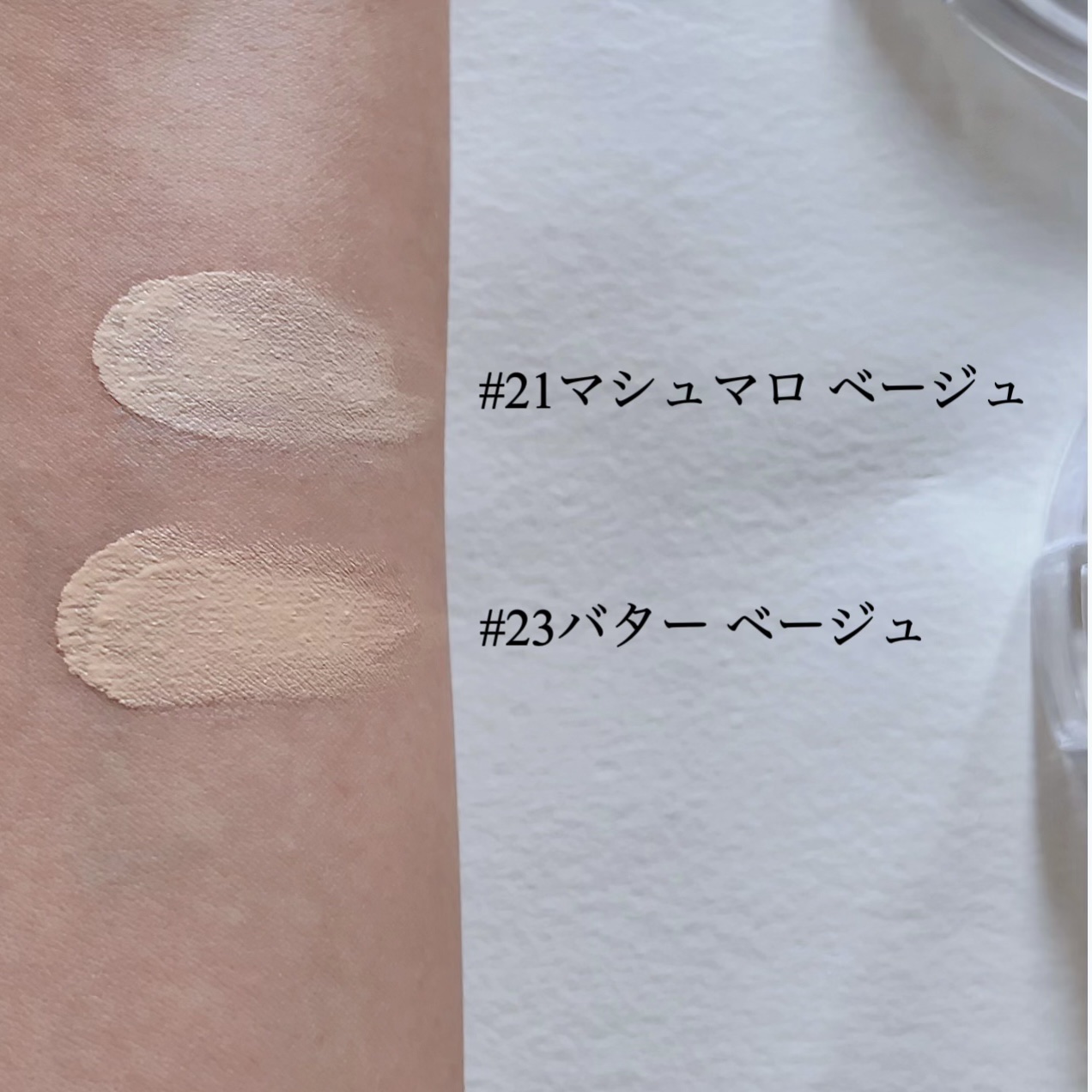 - <21 マシュマロベージュ> 水、シクロペンタシロキサン、酸化チタン、メトキシケイヒ酸エチルヘキシル、サリチル酸オクチル、BG、メチルトリメチコン、イソドデカン、ナイアシンアミ ド、ラウリルポリグリセリル-3ポリジメチルシロキシエチルジメチコン、サ リチル酸ブチルオクチル、オクトクリレン、酸化亜鉛、ポリリシノレイン酸ポリ グリセリル-3、トリメチルシロキシケイ酸、ドクダミエキス、硫酸Mg、ポリ グリセリル-3ポリジメチルシロキシエチルジメチコン、クオタニウム-90ベ ントナイト、(カプリル酸/カプリン酸)グリセリズ、シリカ、ポリメチルシルセ スキオキサン、(アクリレーツ/メタクリル酸ポリトリメチルシロキシ)コポリ マー、(トリメチルシロキシケイ酸/ジメチコノール)クロスポリマー、水酸化A 1、トリエトキシカプリリルシラン、リシノレイン酸ポリグリセリル-3, ステ アリン酸、アデノシン、プルラン、フルクトオリゴ糖、1,2-ヘキサンジオール、グリセリン、チャ葉エキス、トリ(カプリル/カプリン酸)グリセリル、ẞーグ ルカン、マルトデキストリン、コラーゲン、水添レシチン、レウコノストック/ダ イコン根発酵液、マスチック樹脂、ヒアルロン酸Na、ユビキノン、ティーツリ ーエキス、マデカッソシド、アシアチコシド、マデカシン酸、アシアチン酸、酸化 チタン (CI 77891)、CI 77492、CI 77491、CI 77499 <23 バターベージュ> 水、シクロペンタシロキサン、酸化チタン、メトキシケイヒ酸エチルヘキシル、サリチル酸オクチル、BG、メチルトリメチコン、イソドデカン、ナイアシンアミ ド、ラウリルポリグリセリル-3ポリジメチルシロキシエチルジメチコン、サ リチル酸ブチルオクチル、オクトクリレン、酸化亜鉛、ポリリシノレイン酸ポリ グリセリル-3、トリメチルシロキシケイ酸、ドクダミエキス、硫酸Mg、ポリ グリセリル-3ポリジメチルシロキシエチルジメチコン、クオタニウム-90ベ ントナイト、(カプリル酸/カプリン酸)グリセリズ、シリカ、ポリメチルシルセ スキオキサン、(アクリレーツ/メタクリル酸ポリトリメチルシロキシ)コポリ マー、(トリメチルシロキシケイ酸/ジメチコノール)クロスポリマー、水酸化A 1、トリエトキシカプリリルシラン、リシノレイン酸ポリグリセリル-3, ステ アリン酸、アデノシン、プルラン、フルクトオリゴ糖、1,2-ヘキサンジオール、グリセリン、チャ葉エキス、トリ(カプリル/カプリン酸)グリセリル、ẞーグ ルカン、マルトデキストリン、コラーゲン、水添レシチン、レウコノストック/ダ イコン根発酵液、マスチック樹脂、ヒアルロン酸Na、ユビキノン、ティーツリ ーエキス、マデカッソシド、アシアチコシド、マデカシン酸、アシアチン酸、酸化 チタン (CI 77891)、CI 77492、CI 77491、CI 77499