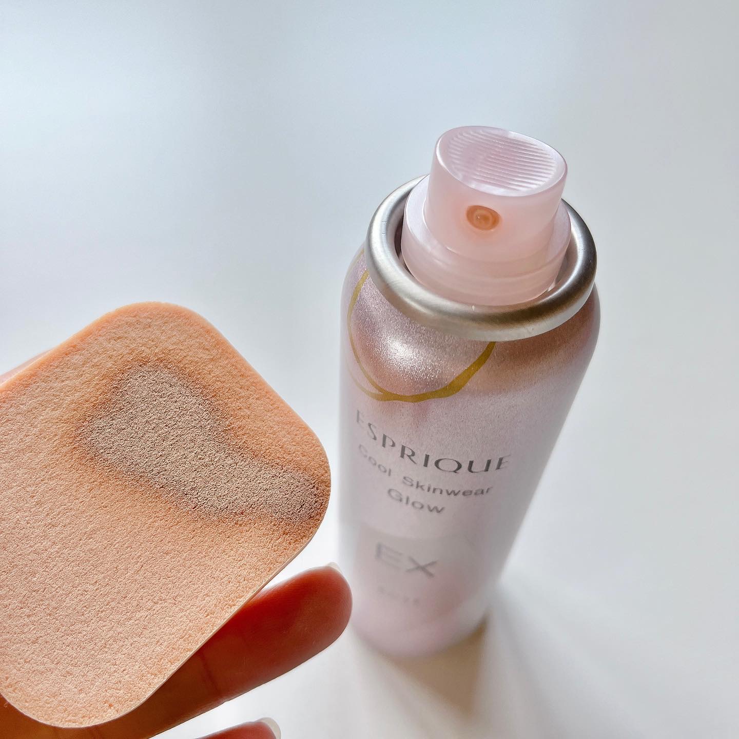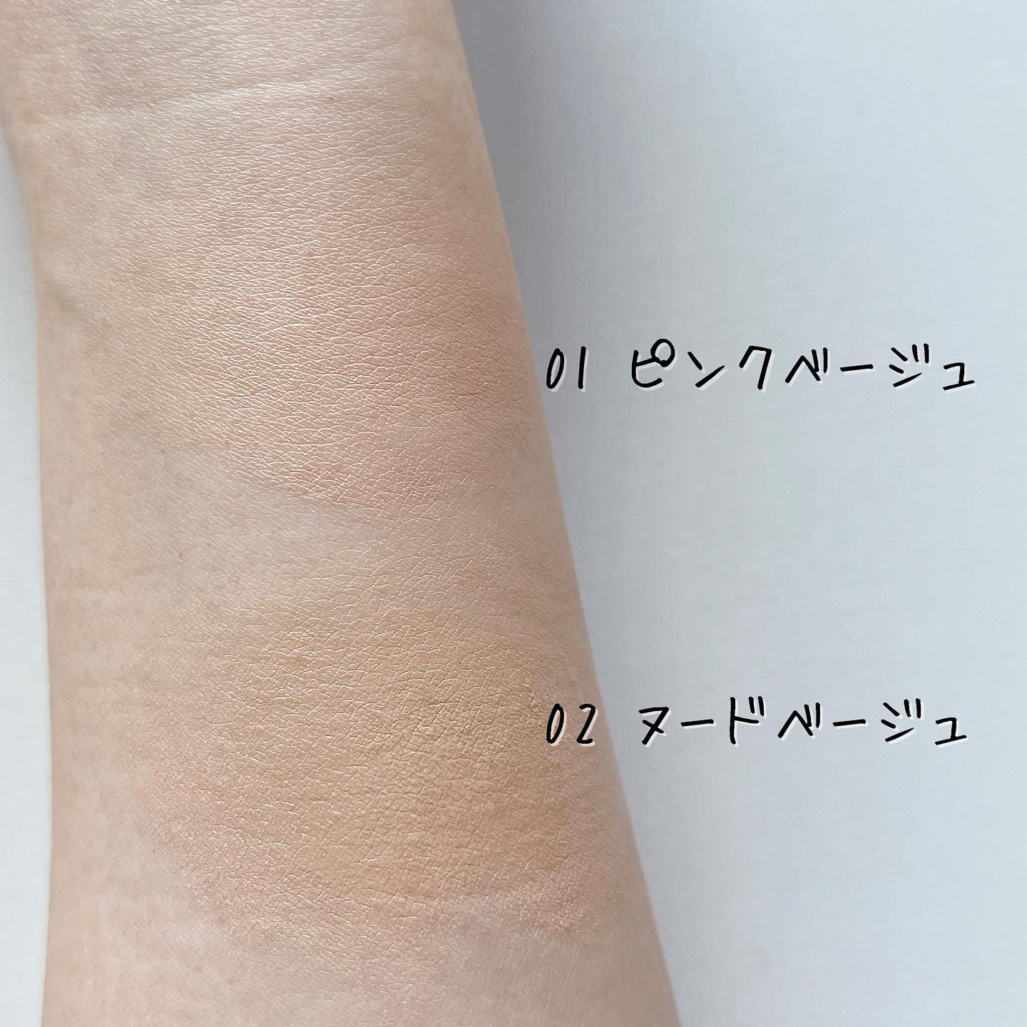 付属のパフにシューッとスプレーして肌に塗布するタイプのベースメイクアイテム。 ひんやりと気持ち良い使い心地で、ツヤ感のある質感にしてくれます◎ 01はピンクベージュで、02ヌードベージュ。 個人的にはピンクの方が健康的な印象になるかな〜と感じました。 UVカット効果もしっかりあるから日差しが気になるこれからの季節にも嬉しいですよね🥰 暑い季節にピッタリな冷感ベース