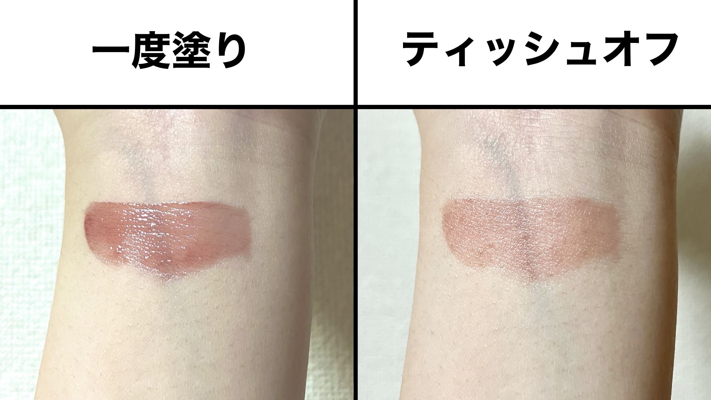 甘酸っぱい香りやブラシの形、シアーな発色など使用感は既存色と大体同じです! 値段は通常版より少し高いですが、 パッケージがオーロラ加工になっており通常版より高級感があります✨ 限定色は2色展開で、こちらはピンクと赤の中間といった感じの可愛らしい色です! 赤リップは初めてでしたが、透け感があるので派手になりすぎず使いやすかったです。 ティッシュオフしてもちゃんとラメが残ります❤️ 色持ちの良さや、唇が荒れやすい私でも特に気にせず使えるところも既存色と同じだったのが良かったです♪