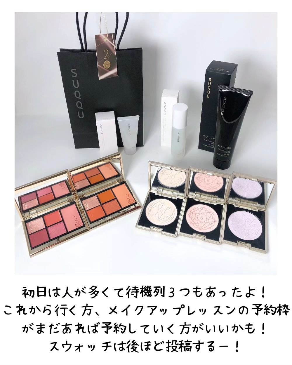 SUQQUならではの粉質と色、そして2色のラメはまぶた、涙袋を際立たせて上品な印象のピンクメイクに仕上げます。 ブラッシュもこのパレットの特徴でシアーな色味のブラッシュをほんのりつけることにより自然な感じで頬に血色感をますように。 特殊なテクニック要らずでどの色からもメイクができるように設計している、とメイクいただいた社員の方にお話しもいただきました。