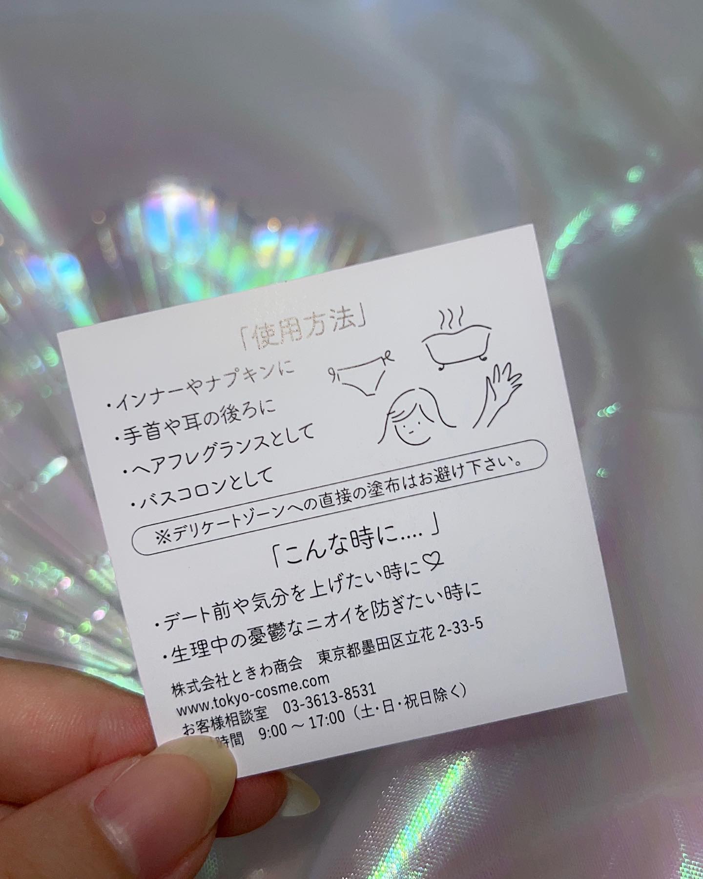 - アルコールフリー、お肌に優しい6種類の植物オイル配合*¹で敏感なデリケートゾーンにも使用できる*²香水です。 99.9%原液のため、インナーやナプキンに1~2滴使用するだけで香りが1日中長続きします。 生理中の不快な臭いや香りで気分を上げたいときに。 *1ホホバ種子油、アルガニアスピノサ核油、月見草油、ヒマワリ種子油、ユチャ種子油、マカデミア種子油 *2デリケートゾーンへの直接の使用はお控えください。"