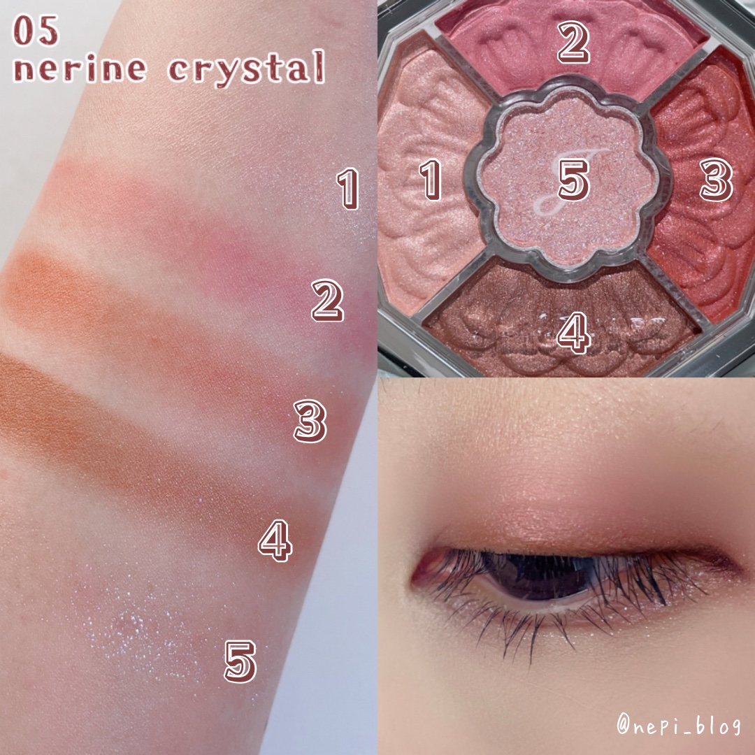 - <01 cymbidium cameo> ジメチコン、タルク、トリエチルヘキサノイン、ホウケイ酸(Ca/Al)、リンゴ酸ジイソステアリル、ラウロイルリシン、ダイマージリノール酸(フィトステリル/イソステアリル/セチル/ステアリル/ベヘニル)、(HDI/PPG/ポリカプロラクトン)クロスポリマー、メタクリル酸メチルクロスポリマー、トリメリト酸トリトリデシル、ステアロイルオキシステアリン酸オクチルドデシル、シリカ、ミネラルオイル、アボカド油、アンズ核油、トコフェロール、ラベンダー油、ローズマリー葉エキス、BHT、(ジメチコン/ビニルジメチコン)クロスポリマー、(ビニルジメチコン/ラウリルジメチコン)クロスポリマー、アモジメチコン、アルミナ、イソドデカン、エチルヘキサン酸セチル、エチルヘキシルグリセリン、オクチルドデカノール、ステアリン酸Mg、ステアリン酸オクチルドデシル、セスキイソステアリン酸ソルビタン、トリエトキシカプリリルシラン、ナイロン-12、ヘキサ(ヒドロキシステアリン酸/ステアリン酸/ロジン酸)ジペンタエリスリチル、ポリメタクリル酸メチル、ワセリン、合成フルオロフロゴパイト、酸化スズ、水酸化Al、水添ポリイソブテン、クロルフェネシン、香料、グンジョウ、コンジョウ、マイカ、酸化チタン、酸化亜鉛、酸化鉄、硫酸Ba、黄4、赤226 <02 viola amethyst> タルク、ジメチコン、トリエチルヘキサノイン、ホウケイ酸(Ca/Al)、リンゴ酸ジイソステアリル、ラウロイルリシン、ダイマージリノール酸(フィトステリル/イソステアリル/セチル/ステアリル/ベヘニル)、(HDI/PPG/ポリカプロラクトン)クロスポリマー、メタクリル酸メチルクロスポリマー、トリメリト酸トリトリデシル、ステアロイルオキシステアリン酸オクチルドデシル、ミネラルオイル、シリカ、アボカド油、アンズ核油、トコフェロール、ラベンダー油、ローズマリー葉エキス、BHT、(ジメチコン/ビニルジメチコン)クロスポリマー、(ビニルジメチコン/ラウリルジメチコン)クロスポリマー、アモジメチコン、イソドデカン、エチルヘキサン酸セチル、エチルヘキシルグリセリン、オクチルドデカノール、ステアリン酸Mg、ステアリン酸オクチルドデシル、セスキイソステアリン酸ソルビタン、トリエトキシカプリリルシラン、ナイロン-12、ヘキサ(ヒドロキシステアリン酸/ステアリン酸/ロジン酸)ジペンタエリスリチル、ホウケイ酸(Ca/Na)、ポリメタクリル酸メチル、ワセリン、合成フルオロフロゴパイト、酸化スズ、水酸化Al、水添ポリイソブテン、クロルフェネシン、香料、(PET/ポリメタクリル酸メチル)ラミネート、グンジョウ、マイカ、酸化チタン、酸化亜鉛、酸化鉄、赤226 <03 daisy topaz> タルク、ジメチコン、トリエチルヘキサノイン、ホウケイ酸(Ca/Al)、リンゴ酸ジイソステアリル、ラウロイルリシン、ダイマージリノール酸(フィトステリル/イソステアリル/セチル/ステアリル/ベヘニル)、(HDI/PPG/ポリカプロラクトン)クロスポリマー、メタクリル酸メチルクロスポリマー、トリメリト酸トリトリデシル、ステアロイルオキシステアリン酸オクチルドデシル、ミネラルオイル、アボカド油、アンズ核油、トコフェロール、ラベンダー油、ローズマリー葉エキス、BHT、(ジメチコン/ビニルジメチコン)クロスポリマー、(ビニルジメチコン/ラウリルジメチコン)クロスポリマー、アモジメチコン、イソドデカン、エチルヘキサン酸セチル、エチルヘキシルグリセリン、オクチルドデカノール、シリカ、ステアリン酸Mg、ステアリン酸オクチルドデシル、セスキイソステアリン酸ソルビタン、トリエトキシカプリリルシラン、ナイロン-12、ヘキサ(ヒドロキシステアリン酸/ステアリン酸/ロジン酸)ジペンタエリスリチル、ポリメタクリル酸メチル、ワセリン、合成フルオロフロゴパイト、酸化スズ、水酸化Al、水添ポリイソブテン、クロルフェネシン、香料、グンジョウ、マイカ、酸化チタン、酸化亜鉛、酸化鉄、黄4、赤226 <04 calandiva garnet> タルク、ジメチコン、トリエチルヘキサノイン、ホウケイ酸(Ca/Al)、リンゴ酸ジイソステアリル、ラウロイルリシン、ダイマージリノール酸(フィトステリル/イソステアリル/セチル/ステアリル/ベヘニル)、(HDI/PPG/ポリカプロラクトン)クロスポリマー、メタクリル酸メチルクロスポリマー、ホウケイ酸(Ca/チタン)、トリメリト酸トリトリデシル、シリカ、ステアロイルオキシステアリン酸オクチルドデシル、合成フルオロフロゴパイト、ミネラルオイル、ホウケイ酸(Ca/Na)、アボカド油、アンズ核油、トコフェロール、ラベンダー油、ローズマリー葉エキス、BHT、(ジメチコン/ビニルジメチコン)クロスポリマー、(ビニルジメチコン/ラウリルジメチコン)クロスポリマー、アモジメチコン、イソドデカン、エチルヘキサン酸セチル、エチルヘキシルグリセリン、オクチルドデカノール、ステアリン酸Mg、ステアリン酸オクチルドデシル、セスキイソステアリン酸ソルビタン、トリエトキシカプリリルシラン、ナイロン-12、ヘキサ(ヒ