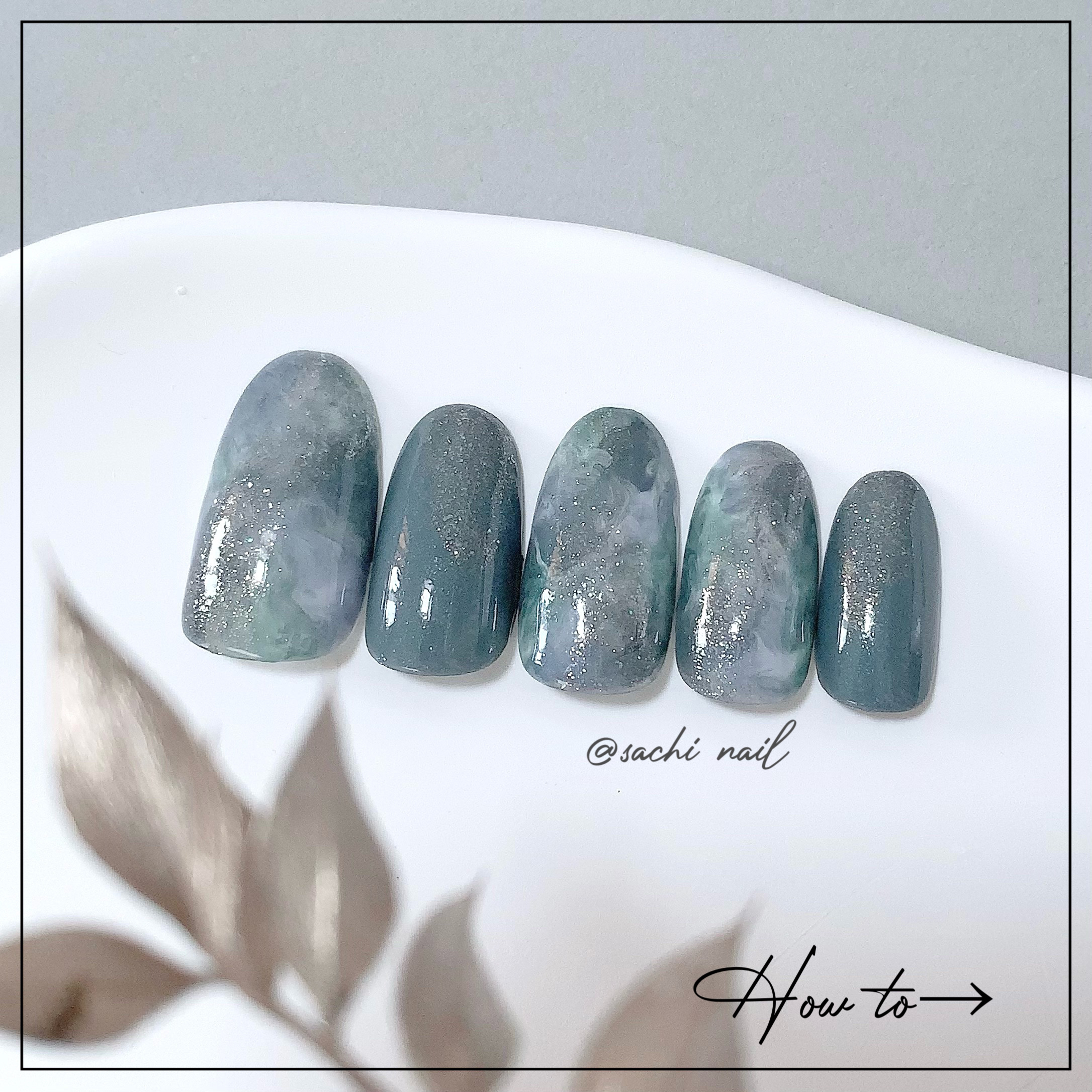 ワンカラーでも指ごとに色を変えるだけでオシャレに見えます💕 画像のようにゴールドラインとストーンを少し足すだけで華やかさがアップ🥰 何度かご紹介したことのあるスポンジで作るグラデーションです✨ スポンジを使うことで境目が綺麗に馴染んでくれます💕 アルミホイルの上でブラウンとトップコートを1:1くらいで混ぜたものを、トップコートのハケに取って3箇所に塗るだけ👌 事前に混ぜたものを塗ることで、爪の上でぼかすより簡単に出来ます💕 ベースカラーが乾く前に点置きしてぼかすことで綺麗にぼかせます✨ スピードが大事なので、使うポリッシュのキャップは全て開けておきましょう😊 天然石のラインはガタガタの方がより天然石っぽく見えるので、ラインを描くのが苦手な方でも大丈夫🙆♀️ 難しそうに見えて、やってみると意外と簡単に出来ます♡