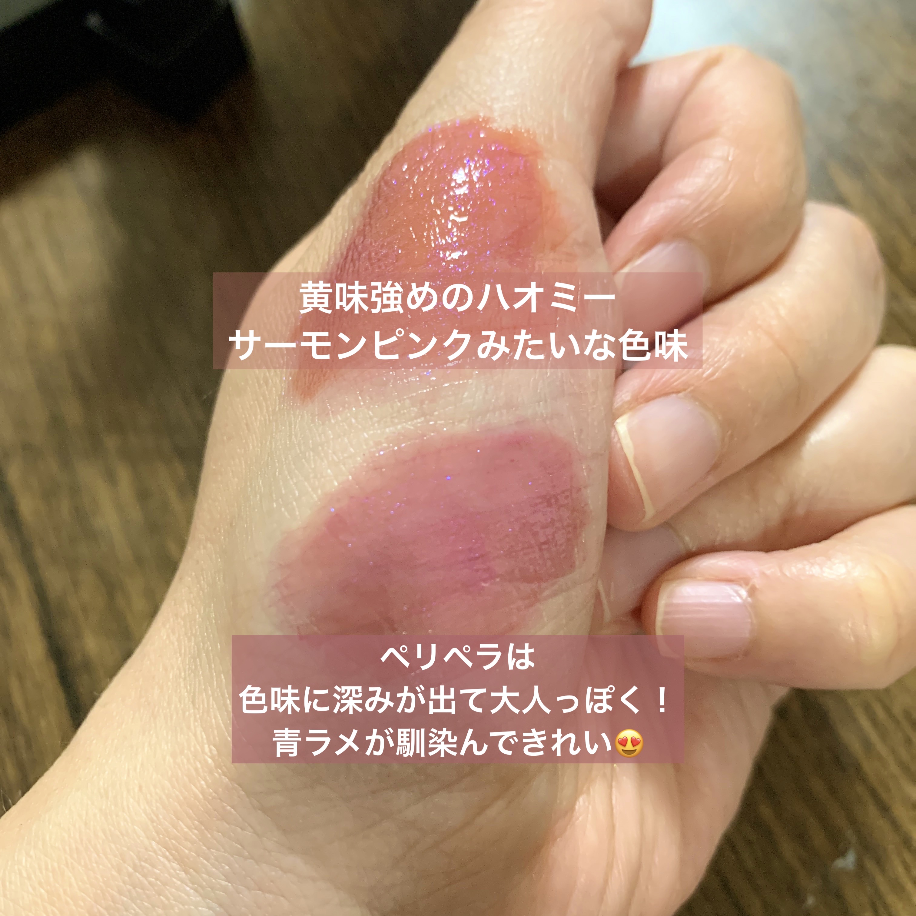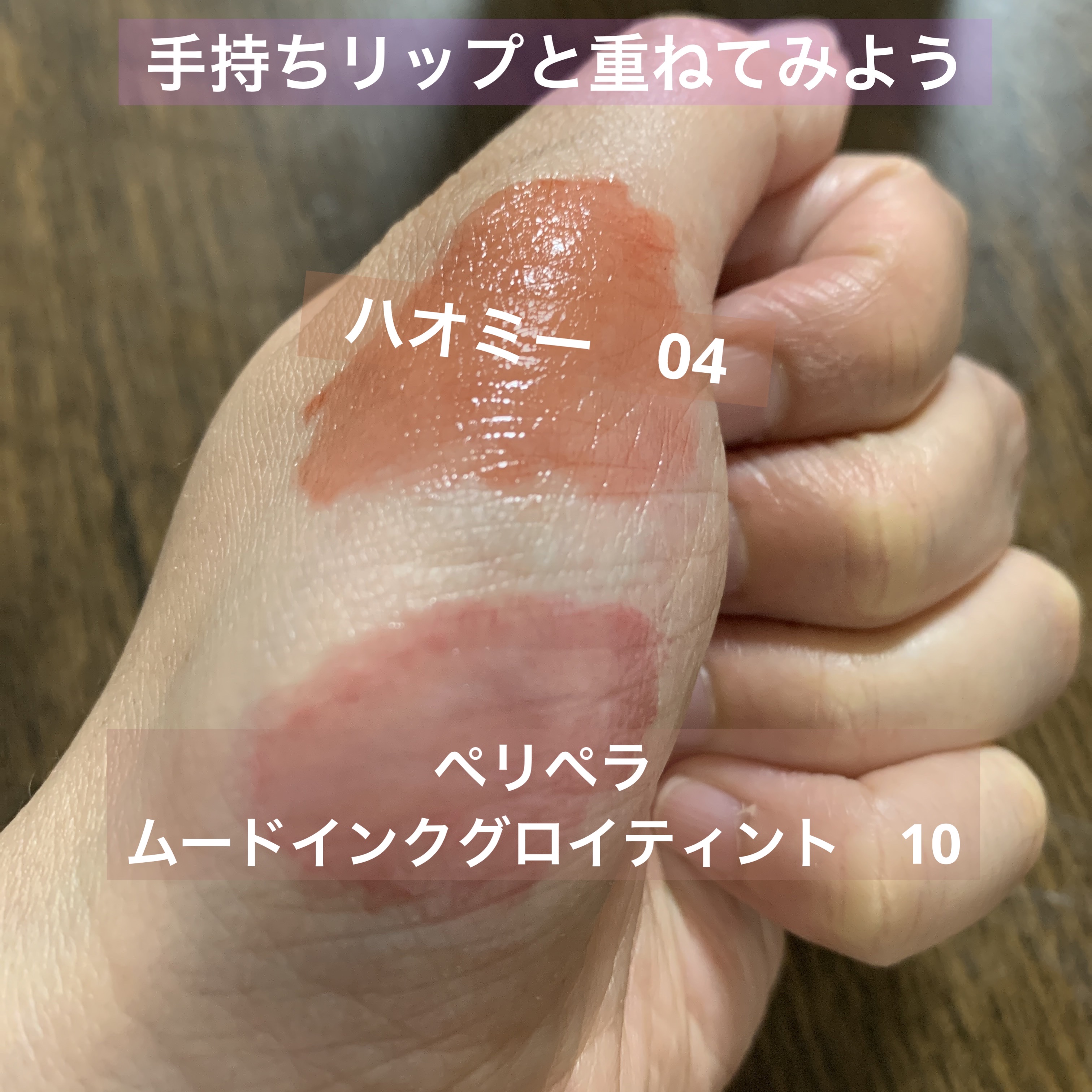 グラスティングウォーターティントは 結構濃いめの色が多くて、手持ちの色もなかなか 出番がなかったのですが… 一度塗りでもしっかり発色します🌸 香りも紅茶みたいな大人っぽい香り☕️ この香りがrom&ndリップで1番好きです😊 rom&ndのほうがより濃くて大人っぽい印象、 PERIPERAは白みが強くより淡くて可愛らしい印象🥰