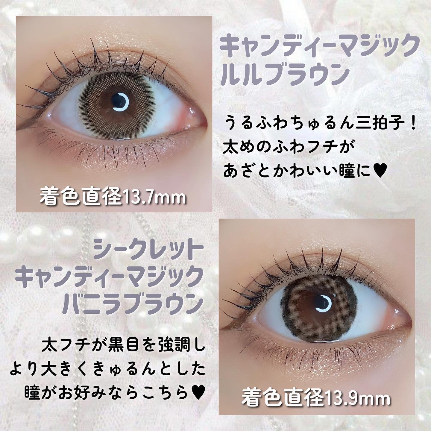 secretcandymagic(シークレットキャンディーマジック)にキラキラ発色の“ラメ入りカラコン”が9/1(月)新登場!✔︎︎︎︎ラメベージュメインのくすみベージュにオーロララメ。グレーっぽさもあって高発色で映える瞳に✨️✔︎︎︎︎ラメ...