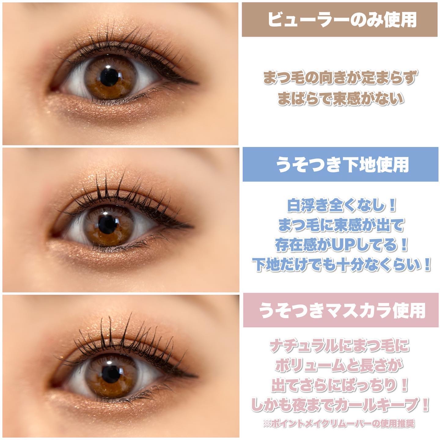 - メイクしたてのカールが夜まで続く!まるでまつげパーマしたみたい。#うそつき下地 強力カールキープで夜までクリアに上向きキープ! 白く残らずまつげになじむクリアカラー。 繊細セパレート仕上げ。 ウォータープルーフ。