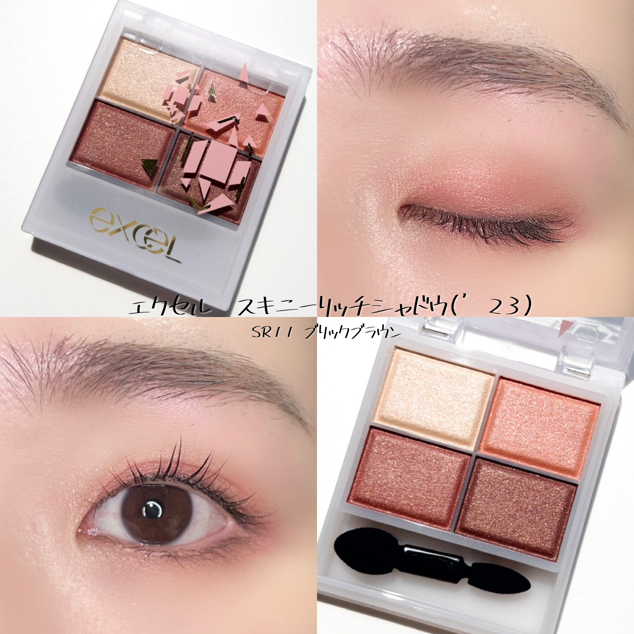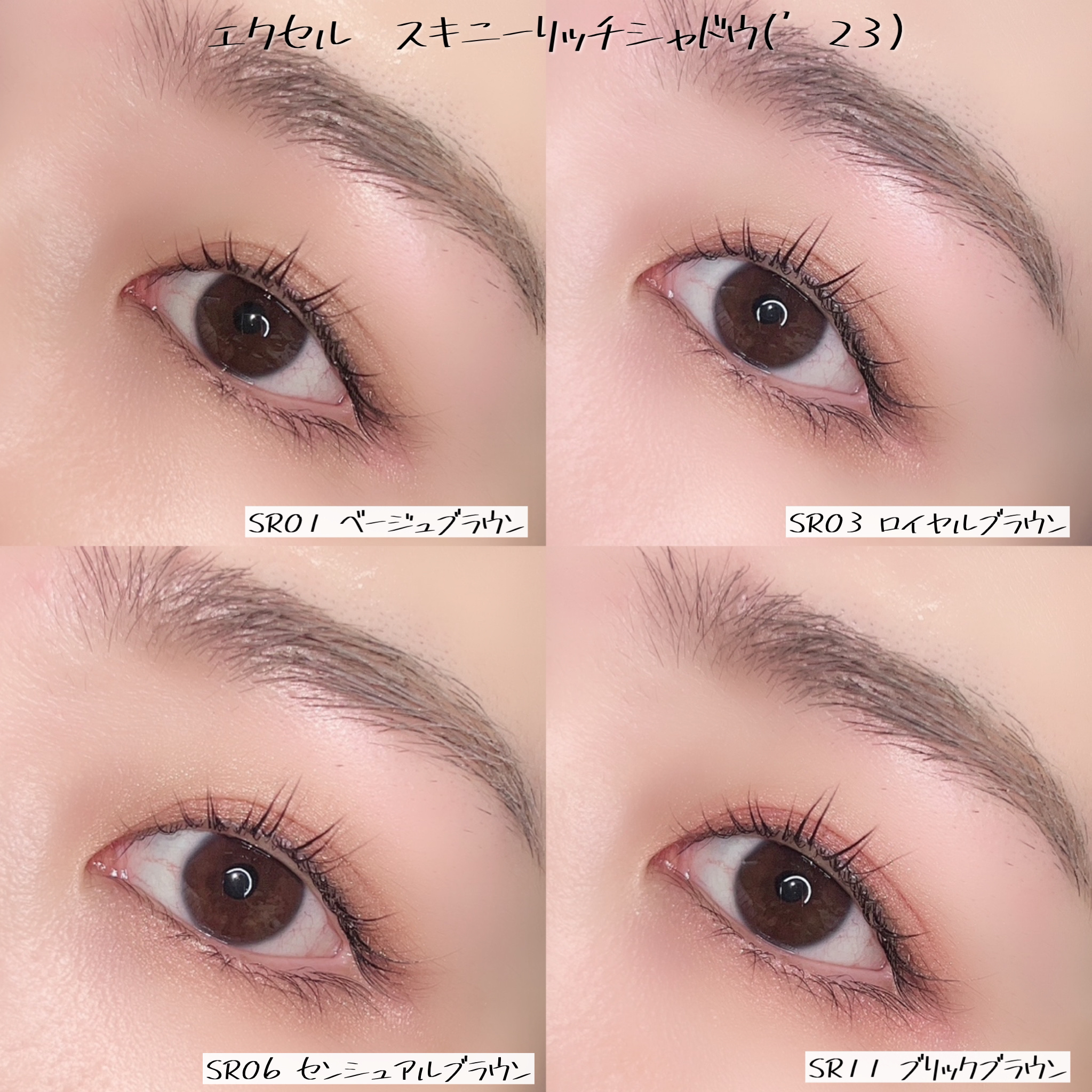 初めてのスキニーリッチシャドウ🫶 可愛い! しっとりした粉質で、粉飛びしにくかったです。 上段はツヤで、下段はパールがキラキラしているかな。SR03はほんのりピンクニュアンスとのことですが、私の肌だとピンクよりオレンジっぽく発色しました。 発色は濃すぎず、薄すぎず丁度いい感じ。 グラデーションをつくるのが簡単でした♡