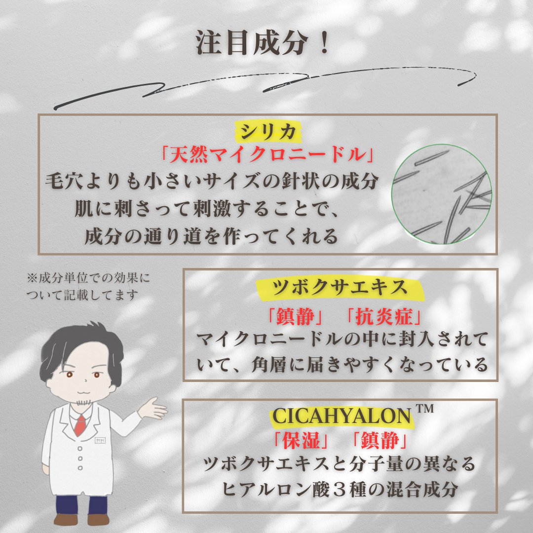 - 肌本来の持つ力と美容成分の届け方に着目。 乾燥でごわついた肌にも角層まで美容成分*1*2を届け、肌本来の美しさを保ち、スキンケアの角層までの浸透をサポートします。 CICA*1と天然マイクロニードル(天然の美容針)*2を配合し独自に開発しました。 シリカ(スクラブ)美容針:195,000本配合 *1ツボクサエキス(整肌) *2シリカ(スクラブ) [使い方] 1. 洗顔後すぐに適量手にとり、顔全体に塗り広げます。 2. 手のひらで顔全体を押さえながら、美容液を肌に入れ込むような イメージでマッサージするように肌になじませます。 [使用ポイント] * 角質ケアが特に必要な個所、気になる箇所への集中スペシャルケアにオススメ! * 顔全体へ塗り広げると、夜の間にエステ級ケアを実現! (顔全体へご使用の際には少量から使用し、肌へのテスト期間を設けてください) ※使用時の注意事項を必ずご確認の上、ご使用くださいませ。