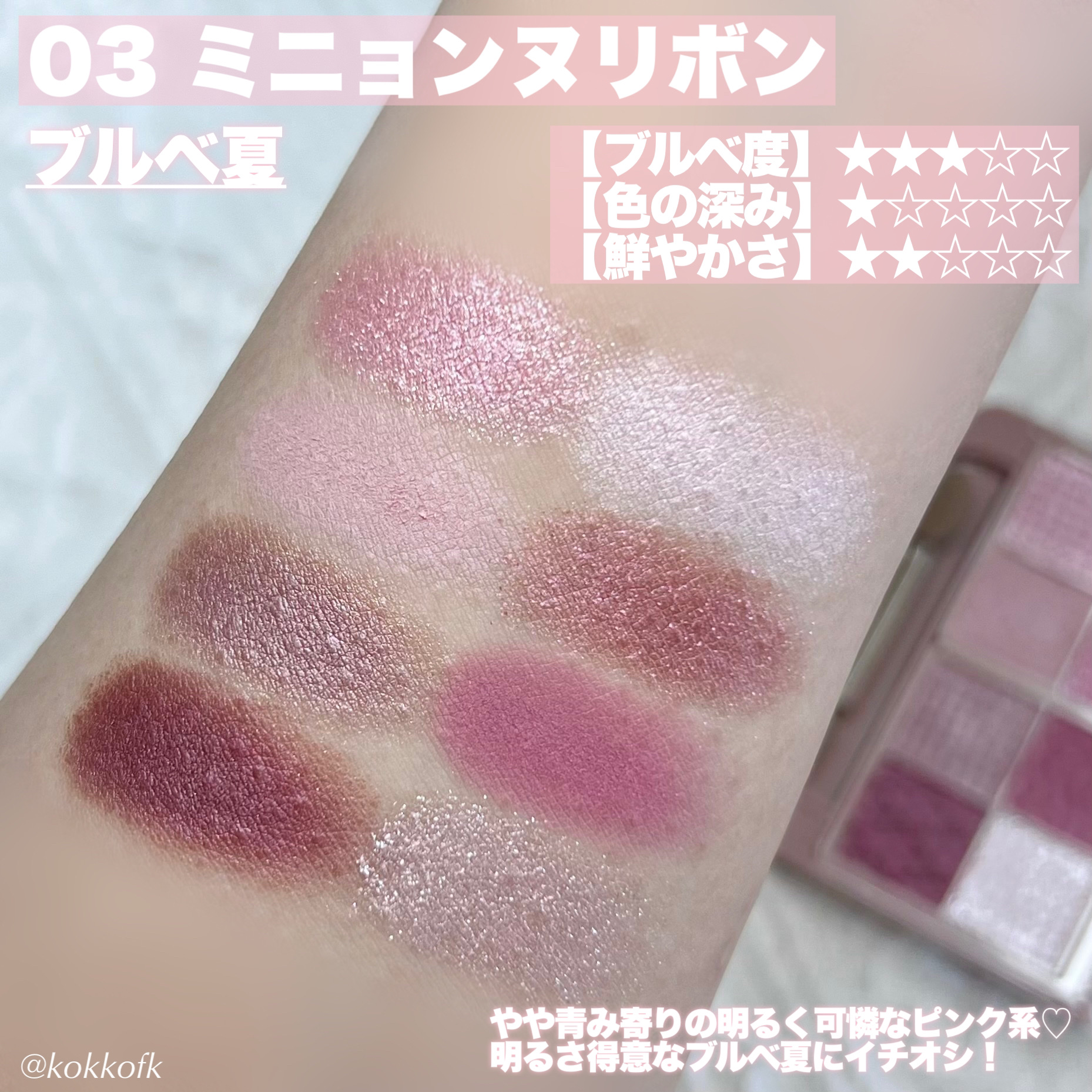CANMAKEの多色パレット🌼 マット・パール・ラメ3つの質感があって気分によって何通りも使い分けができるし何より手のひらサイズなのが調度よい◎ 01と03がブルベさんにオススメなので持ってない方は是非チェックしてみてね🫰 シーン問わず使いやすい肌馴染み良しなピンクベージュ 03 ミニョンヌリボンやや青み寄りのピンクが多め大人な甘さのピンク
