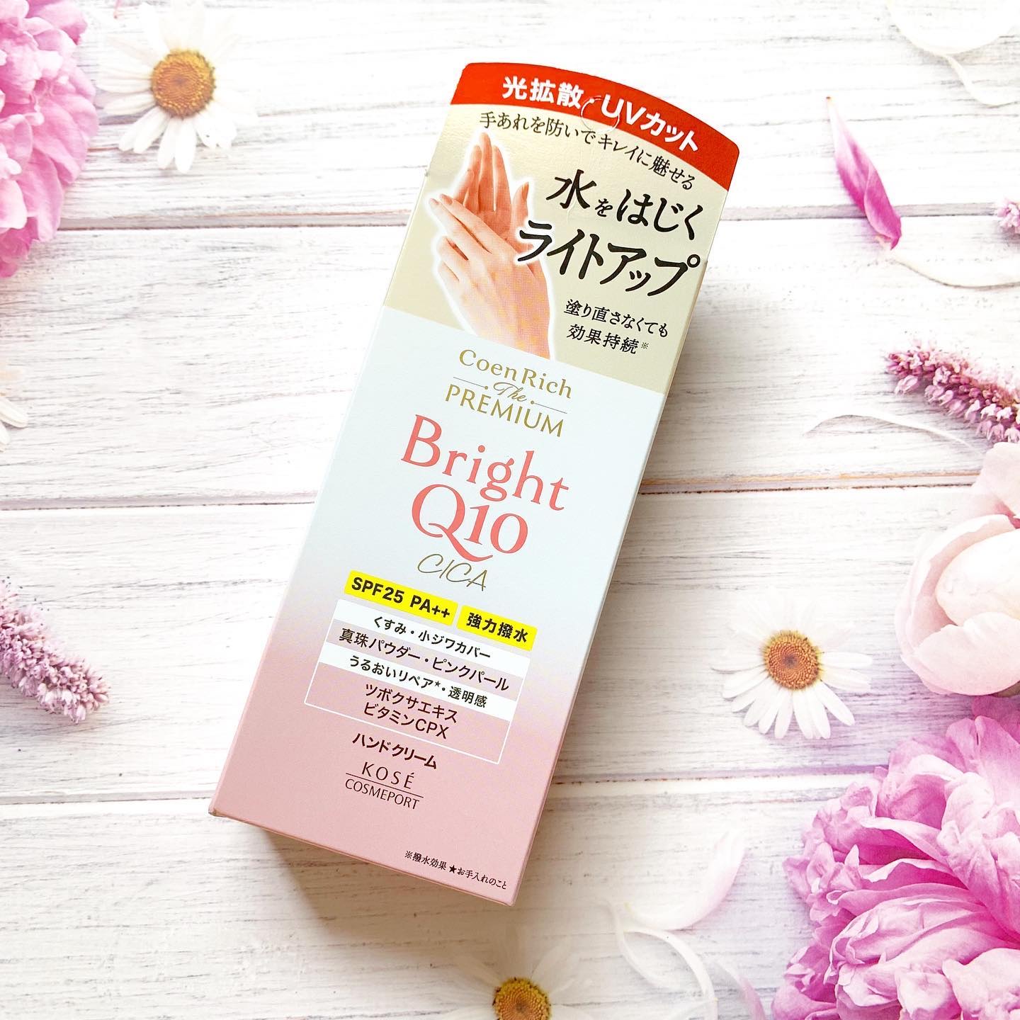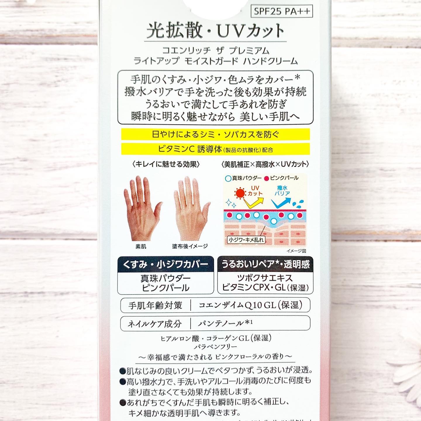 - 肌なじみの良いクリームでベタつきにくい、コエンザイムQ10(保湿)配合のプレミアムなハンドクリーム。光拡散×撥水×UVカット効果で、あれがちでくすんだ手肌をキレイにみせ塗りなおさなくても効果が持続*。真珠パウダー・ピンクパール配合。明るく美しい手肌へ。SPF25PA++。*メイクアップ効果による