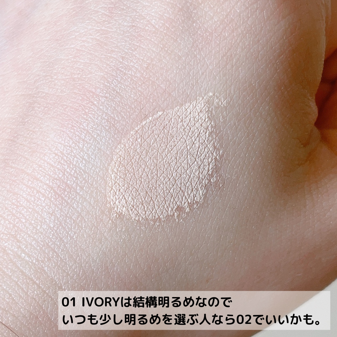 - <01 Ivory> 水、酸化チタン、イソドデカン、ジメチコン、シクロペンタシロキサン、安息香酸アルキル(C12-15)、セバシン酸ジイソプロピル、グリセリン、サリチル酸エチルヘキシル、メタクリル酸メチルクロスポリマー、セチルPEG/PPG-10/1ジメチコン、ナイアシンアミド、ジエチルアミノヒドロキシベンゾイル安息香酸ヘキシル、ポリシリコーン-15、ビスエチルヘキシルオキシフェノールメトキシフェニルトリアジン、BG、トリメチルシロキシケイ酸、硫酸Mg、メチルトリメチコン、PEG-10ジメチコン、酸化鉄、(ビスヒドロキシプロピルジメチコン/SMDI)コポリマー、合成フルオロフロゴパイト、マイカ、ステアリン酸、水酸化Al、ジメチコンクロスポリマー、ラウロイルリシン、カプリル酸グリセリル、カプリリルグリコール、アルミナ、ジステアルジモニウムヘクトライト、エチルヘキシルグリセリン、トリエトキシカプリリルシラン、香料、アデノシン、炭酸プロピレン、トコフェロール、ポリグリセリル-3ポリジメチルシロキシエチルジメチコン、(アクリレーツ/ジメチコン)コポリマー、1,2-ヘキサンジオール、ヤマノイモ根エキス、スミレ花エキス、マコンブエキス、アロエベラ葉エキス、ウルムスダビディアナ根エキス <02 Beige> 水、酸化チタン、イソドデカン、ジメチコン、シクロペンタシロキサン、安息香酸アルキル(C12-15)、セバシン酸ジイソプロピル、グリセリン、サリチル酸エチルヘキシル、メタクリル酸メチルクロスポリマー、セチルPEG/PPG-10/1ジメチコン、ナイアシンアミド、ジエチルアミノヒドロキシベンゾイル安息香酸ヘキシル、ポリシリコーン-15、ビスエチルヘキシルオキシフェノールメトキシフェニルトリアジン、酸化鉄、BG、トリメチルシロキシケイ酸、硫酸Mg、メチルトリメチコン、PEG-10ジメチコン、(ビスヒドロキシプロピルジメチコン/SMDI)コポリマー、マイカ、ステアリン酸、水酸化Al、ジメチコンクロスポリマー、ラウロイルリシン、カプリル酸グリセリル、カプリリルグリコール、アルミナ、ジステアルジモニウムヘクトライト、エチルヘキシルグリセリン、トリエトキシカプリリルシラン、合成フルオロフロゴパイト、香料、アデノシン、炭酸プロピレン、トコフェロール、ポリグリセリル-3ポリジメチルシロキシエチルジメチコン、(アクリレーツ/ジメチコン)コポリマー、1,2-ヘキサンジオール、ウルムスダビディアナ根エキス、アロエベラ葉エキス、マコンブエキス、ヤマノイモ根エキス、スミレ花エキス