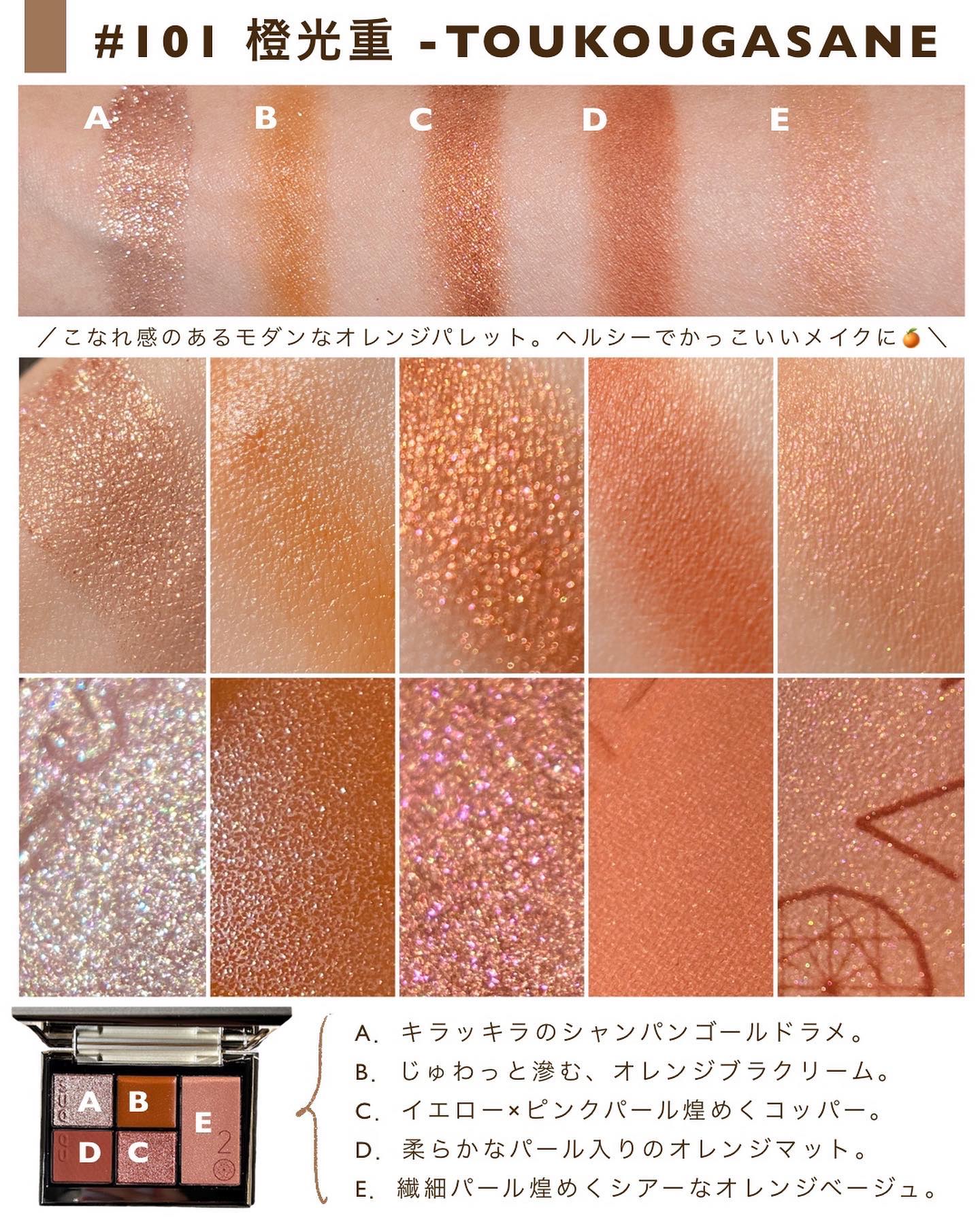 2023年にどどんとリニューアル!全30色展開で新たに発売をスタートしました。 多色パールがこれでもか!ってくらいたっぷり煌めくピンクベージュはほんの少しオレンジのニュアンスも感じられるヘルシーなカラー。 こういうピンクベージュ系の単色シャドウって、ほんとにメイクのベース的に使いやすくて重宝するのよね😚