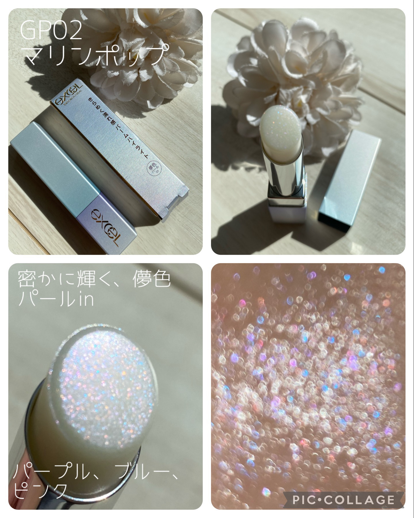 - <GP01 フローラルポップ> 水添ポリデセン、トリエチルヘキサノイン、リンゴ酸ジイソステアリル、ワセリン、合成ワックス、シリカ、水添ポリイソブテン、(エチレン/プロピレン)コポリマー、キャンデリラロウ、マカデミア種子油、オリーブ果実油、カニナバラ果実油、ジメチルシリル化シリカ、トコフェロール、(+/-)ホウケイ酸(Ca/Al)、マイカ、合成フルオロフロゴパイト、酸化スズ、酸化チタン <GP02 マリンポップ> 水添ポリデセン、トリエチルヘキサノイン、リンゴ酸ジイソステアリル、ワセリン、合成ワックス、シリカ、水添ポリイソブテン、(エチレン/プロピレン)コポリマー、キャンデリラロウ、マカデミア種子油、オリーブ果実油、カニナバラ果実油、ジメチルシリル化シリカ、トコフェロール、(+/-)ホウケイ酸(Ca/Al)、マイカ、合成フルオロフロゴパイト、酸化スズ、酸化チタン