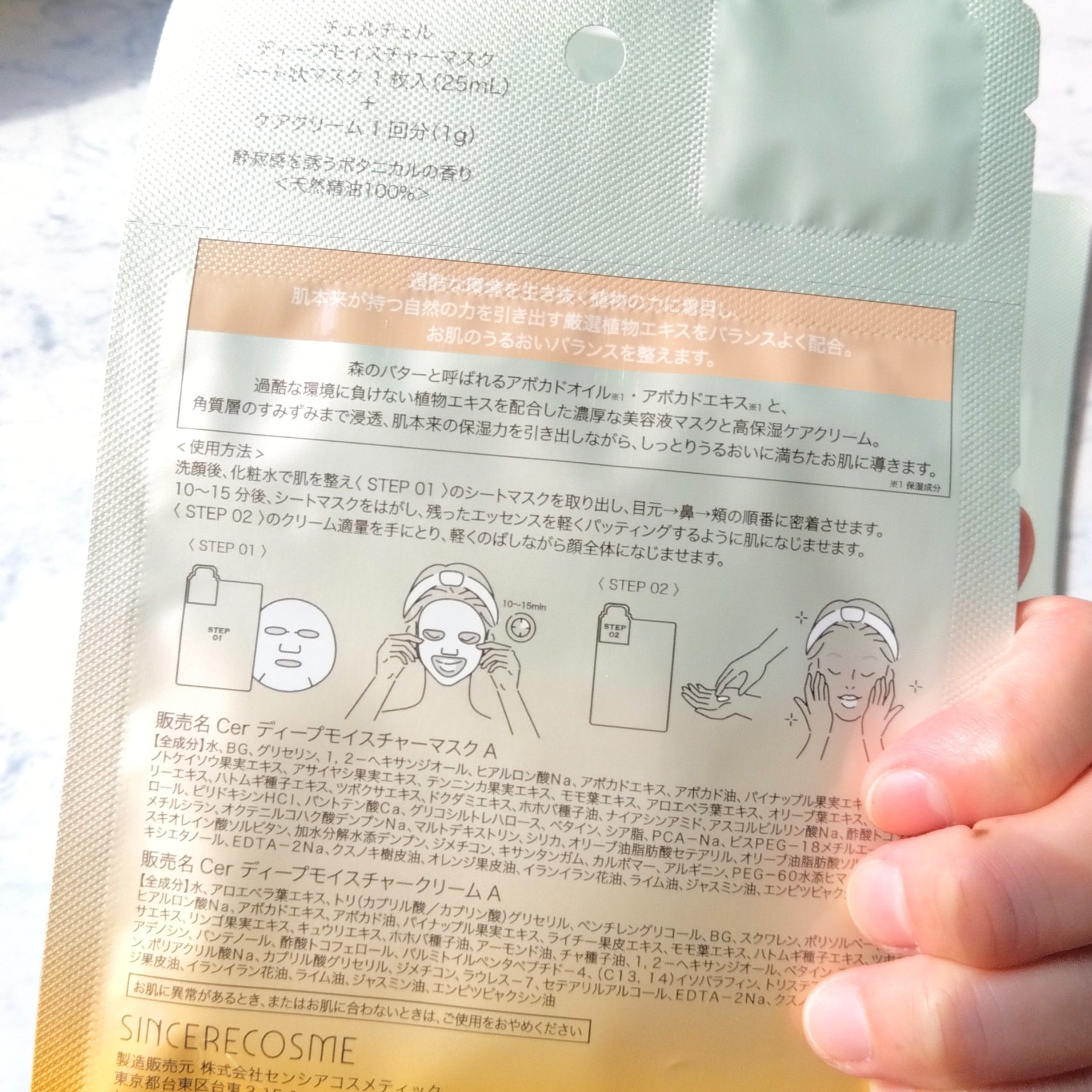 - Cer ディープモイスチャーマスク A 水、BG、グリセリン、1,2-ヘキサンジオール、ヒアルロン酸Na、アボカドエキス、アボカド油、パイナップル果実エキス、クダモノトケイソウ果実エキス、アサイヤシ果実エキス、テンニンカ果実エキス、モモ葉エキス、アロエベラ葉エキス、オリーブ葉エキス、ブロッコリーエキス、ハトムギ種子エキス、ツボクサエキス、ドクダミエキス、ホホバ種子油、ナイアシンアミド、アスコルビルリン酸Na、酢酸トコフェロール、ピリドキシンHCl、パントテン酸Ca、グリコシルトレハロース、ベタイン、シア脂、PCA-Na、ビスPEG-18メチルエーテルジメチルシラン、オクテニルコハク酸デンプンNa、マルトデキストリン、シリカ、オリーブ油脂肪酸セテアリル、オリーブ油脂肪酸ソルビタン、セスキオレイン酸ソルビタン、加水分解水添デンプン、ジメチコン、キサンタンガム、カルボマー、アルギニン、PEG-60水添ヒマシ油、フェノキシエタノール、EDTA-2Na、クスノキ樹皮油、オレンジ果皮油、イランイラン花油、ライム油、ジャスミン油、エンピツビャクシン油 Cer ディープモイスチャークリーム A 水、アロエベラ葉エキス、トリ(カプリル酸/カプリン酸)グリセリル、ペンチレングリコール、BG、スクワレン、ポリソルベート80、ヒアルロン酸Na、アボカドエキス、アボカド油、パイナップル果実エキス、ライチー果皮エキス、モモ葉エキス、ハトムギ種子エキス、ツボクサエキス、リンゴ果実エキス、キュウリエキス、ホホバ種子油、アーモンド油、チャ種子油、1,2-ヘキサンジオール、ベタイン、アラントイン、アデノシン、パンテノール、酢酸トコフェロール、パルミトイルペンタペプチド-4、(C13,14)イソパラフィン、トリステアリン酸ソルビタン、ポリアクリル酸Na、カプリル酸グリセリル、ジメチコン、ラウレス-7、セテアリルアルコール、EDTA-2Na、クスノキ樹皮油、オレンジ果皮油、イランイラン花油、ライム油、ジャスミン油、エンピツビャクシン油