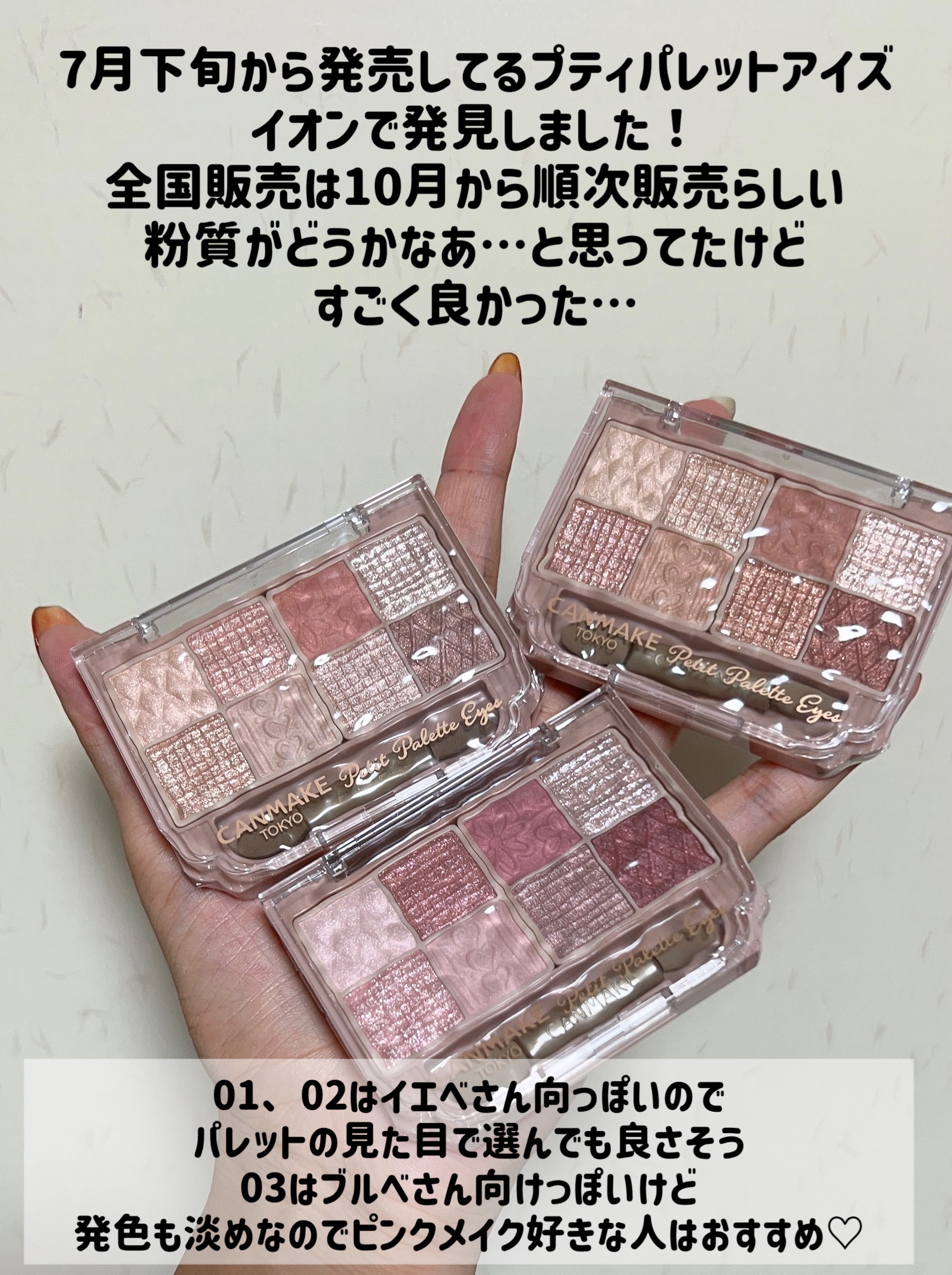 キャンメイクのプティパレットアイズを全色スウォッチしました🙌🏻 イエベ春(2nd夏)さんにおすすめ ✔︎01プリュムフラワー ✔︎M03 ミルキーチェリコッタ(ニュートラル) ブルベ冬さんにおすすめ ✔︎03 ミニョンヌリボン(濃い色を使う) ✔︎M02 ロマンティックフォグ