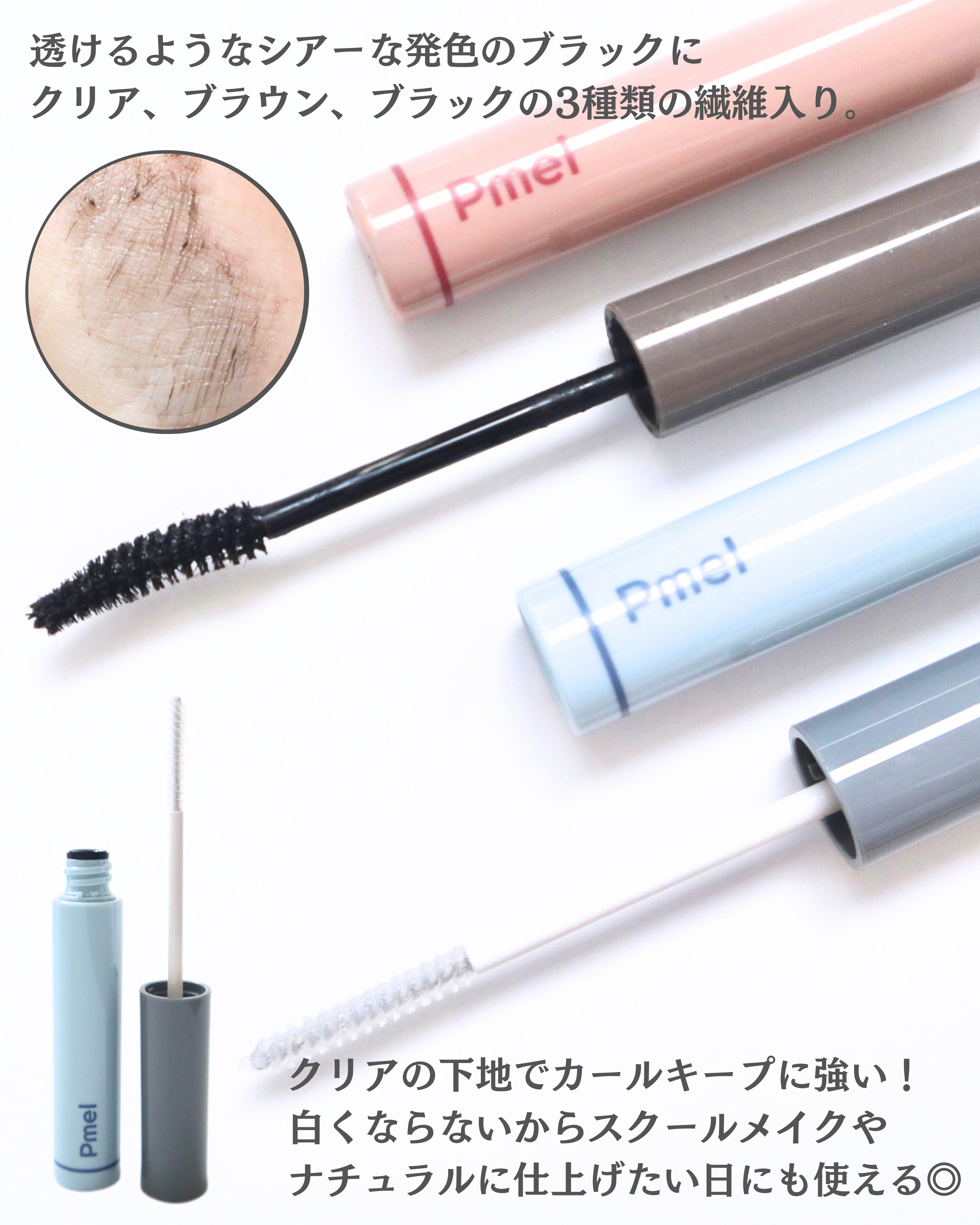 ナチュラルだけ目力UPが目指せるマスカラと下地。 美容系クリエイター ありちゃんのアドバイスにより商品開発された商品✨ ブラック、ブラウン、クリアの3種のファイバーと、さりげないクリアブラックの駅が自然に目力UPと抜け感、長く見せてくれます。 美容成分が入っているからまつ毛がダメージある時に塗ってあげると良いですね。