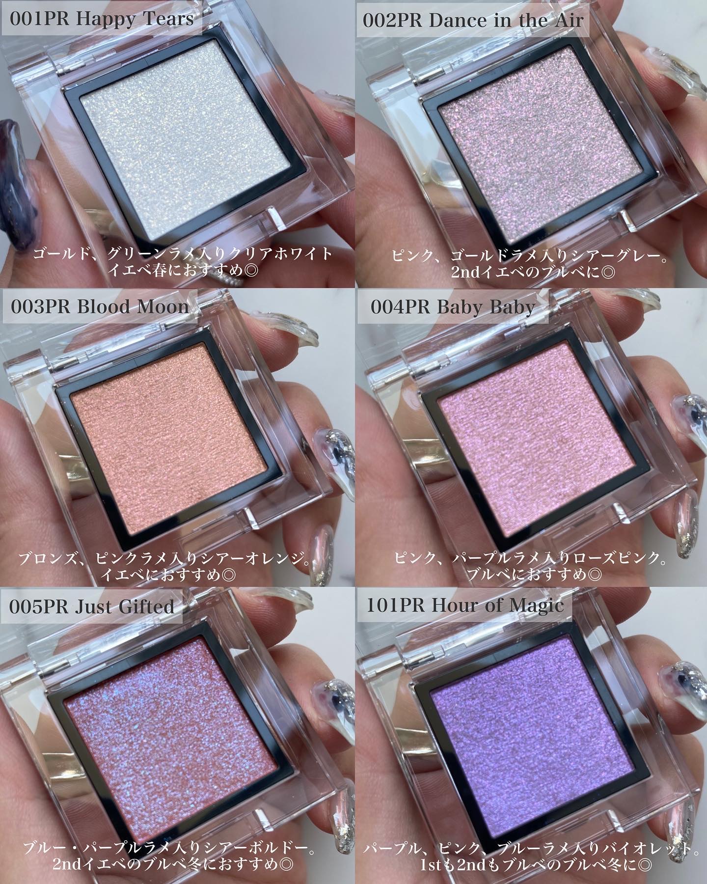 - <001PR Happy Tears> ジメチコン、ホウケイ酸(Ca/Al)、ホウケイ酸(Ca/チタン)、水添ポリイソブテン、シリカ、(ジメチコン/ビニルジメチコン)クロスポリマー、リンゴ酸ジイソステアリル、ナイロン-12、トコフェロール、(ビニルジメチコン/ラウリルジメチコン)クロスポリマー、トリエチルヘキサノイン、酸化スズ、マイカ、酸化チタン、酸化亜鉛 <002PR Dance in the Air> ジメチコン、ホウケイ酸(Ca/チタン)、ホウケイ酸(Ca/Al)、水添ポリイソブテン、シリカ、(ジメチコン/ビニルジメチコン)クロスポリマー、リンゴ酸ジイソステアリル、ナイロン-12、トコフェロール、(ビニルジメチコン/ラウリルジメチコン)クロスポリマー、トリエチルヘキサノイン、酸化スズ、グンジョウ、マイカ、酸化チタン、酸化亜鉛、酸化鉄 <003PR Blood Moon> ジメチコン、ホウケイ酸(Ca/Al)、ホウケイ酸(Ca/Na)、シリカ、水添ポリイソブテン、(ジメチコン/ビニルジメチコン)クロスポリマー、リンゴ酸ジイソステアリル、ナイロン-12、トコフェロール、(ビニルジメチコン/ラウリルジメチコン)クロスポリマー、トリエチルヘキサノイン、酸化スズ、グンジョウ、マイカ、酸化チタン、酸化亜鉛、酸化鉄 <004PR Baby Baby> ジメチコン、ホウケイ酸(Ca/Na)、シリカ、(ジメチコン/ビニルジメチコン)クロスポリマー、水添ポリイソブテン、ホウケイ酸(Ca/Al)、リンゴ酸ジイソステアリル、ナイロン-12、トコフェロール、(ビニルジメチコン/ラウリルジメチコン)クロスポリマー、トリエチルヘキサノイン、酸化スズ、グンジョウ、マイカ、酸化チタン、酸化亜鉛、酸化鉄 <005PR Just Gifted> ジメチコン、ホウケイ酸(Ca/Al)、ホウケイ酸(Ca/Na)、シリカ、水添ポリイソブテン、(ジメチコン/ビニルジメチコン)クロスポリマー、リンゴ酸ジイソステアリル、ホウケイ酸(Ca/チタン)、ナイロン-12、トコフェロール、(ビニルジメチコン/ラウリルジメチコン)クロスポリマー、トリエチルヘキサノイン、酸化スズ、グンジョウ、マイカ、酸化チタン、酸化亜鉛、酸化鉄 <101PR Hour of Magic(限定色)> ジメチコン、ホウケイ酸(Ca/Na)、ホウケイ酸(Ca/Al)、シリカ、ホウケイ酸(Ca/チタン)、(ジメチコン/ビニルジメチコン)クロスポリマー、水添ポリイソブテン、リンゴ酸ジイソステアリル、ナイロン-12、トコフェロール、(ビニルジメチコン/ラウリルジメチコン)クロスポリマー、トリエチルヘキサノイン、マルトデキストリン、合成フルオロフロゴパイト、酸化スズ、カルミン、グンジョウ、コンジョウ、マイカ、酸化チタン、酸化亜鉛、酸化鉄