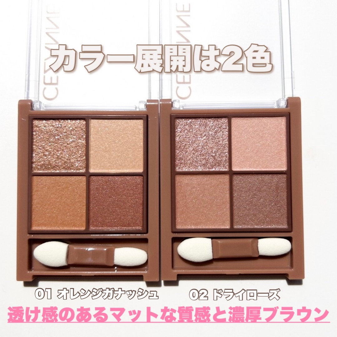- 透け感マット×濃厚ブラウンの4色アイシャドウ。 しっかり目元を引き締めるビターなブラウンカラー。 透け感のあるブラウンを重ねて、自然な陰影のある目元へ。 ふんわり柔らかなパウダーなので、スルスル伸びてまぶたにピタッと密着。 保湿成分(スクワラン、ホホバ種子油)配合。
