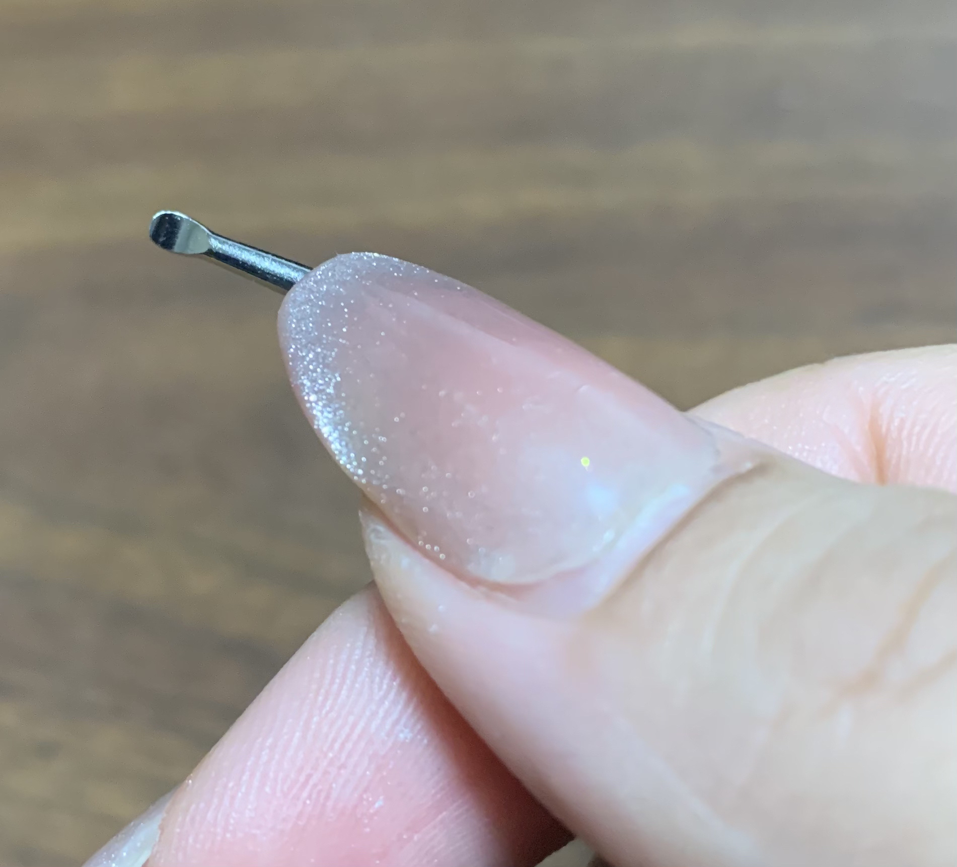 ノンワイプトップ塗ってから擦るの面倒だし厚みを出したくないので、カラージェル硬化してから、エタノールで拭き取り、パウダー擦り付けました。 可愛くて、何度も指先見ちゃいます。太陽☀️の外で見てもキラキラ反射して可愛い💅✨ 光の当たり方により、薄グリーンっぽいオーロラ感〜オレンジ感〜ピンク感 のある輝き。画像で見るより実際は、もっとオーロラ感もありとにかく可愛いです。
