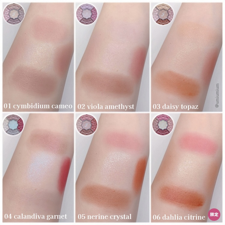 大人気のマシュマロフィニッシュパウダー~Abloom~に繊細パールを配合したツヤ肌仕上がりのパウダーが仲間入りしました! 既存Abloomと同じく中身はセットされた5色を混ぜて使うタイプ!肌のくすみや色ムラを補正してくれてトーンアップ*してくれるんです。 01 ハイドレンジアガーデンは淡いラベンダーカラーで透明感*を与えてくれて儚げな印象に。
