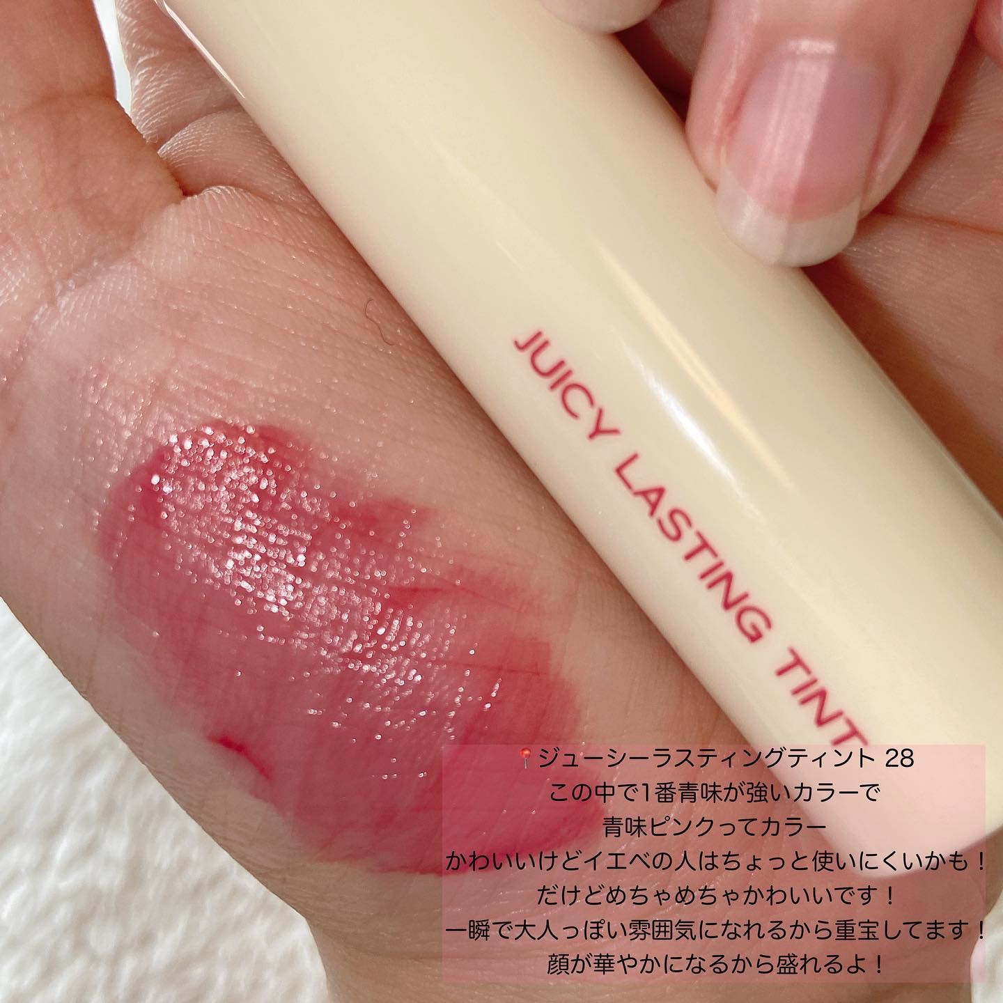 とにかくツヤツヤでぷるぷるの仕上がりになって最高にかわいい♡ 色持ちも抜群で食べても落ちにくいところもいい!! 密着力が高くてむっちりとしたかわいい唇に! それぞれ香りがついていて、フルーティーグラムティントはりんごのような香りで、ジューシーイングヌードグラスはブドウのような香りがするよ!