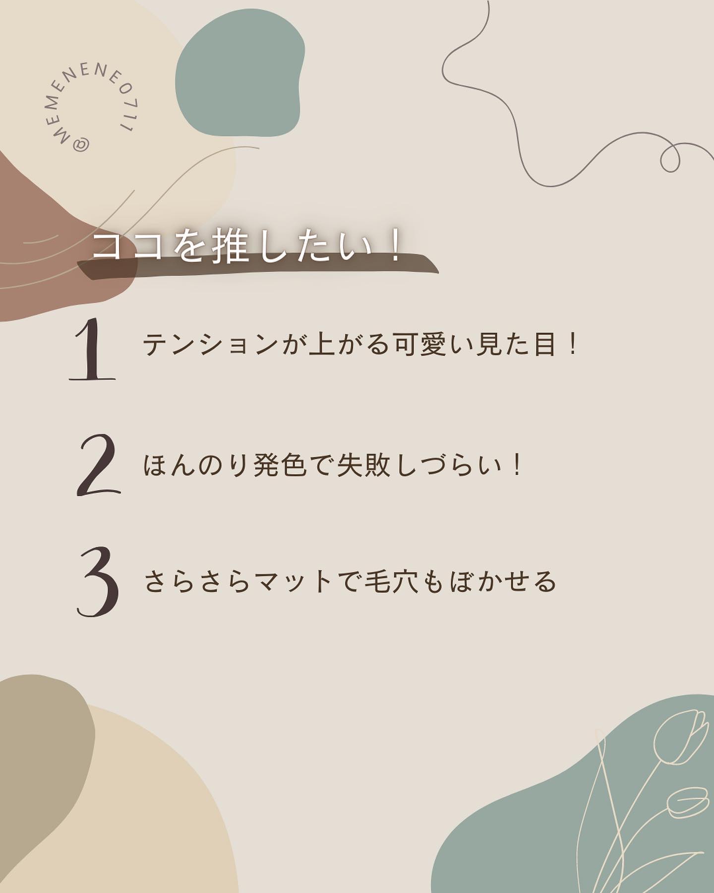 多孔質パウダーでなめらか肌に! 軽い&カバー力でささっと仕上がる! ヒアルロン酸配合で自分の肌のような仕上がり&して乾燥しづらい! サラサラ★★★★☆ しっとり★★★☆☆ 乾燥 ★★☆☆☆ 保湿系のプライマーは相性最悪なので要注意です!!! さらっとした肌に仕上げた上でパウダーファンデを使うとさらさらっと乗ってくれて良きでした。 カバー力もあるし時短だなと思った!