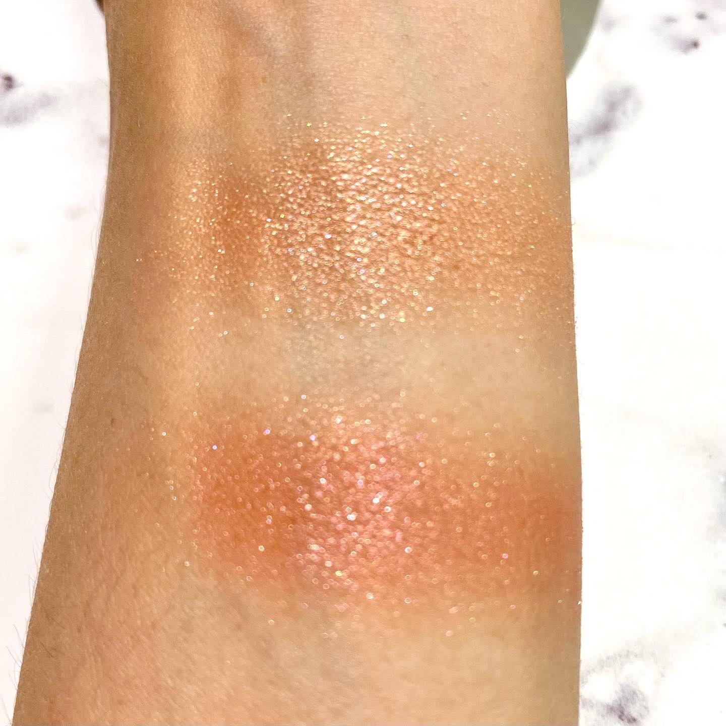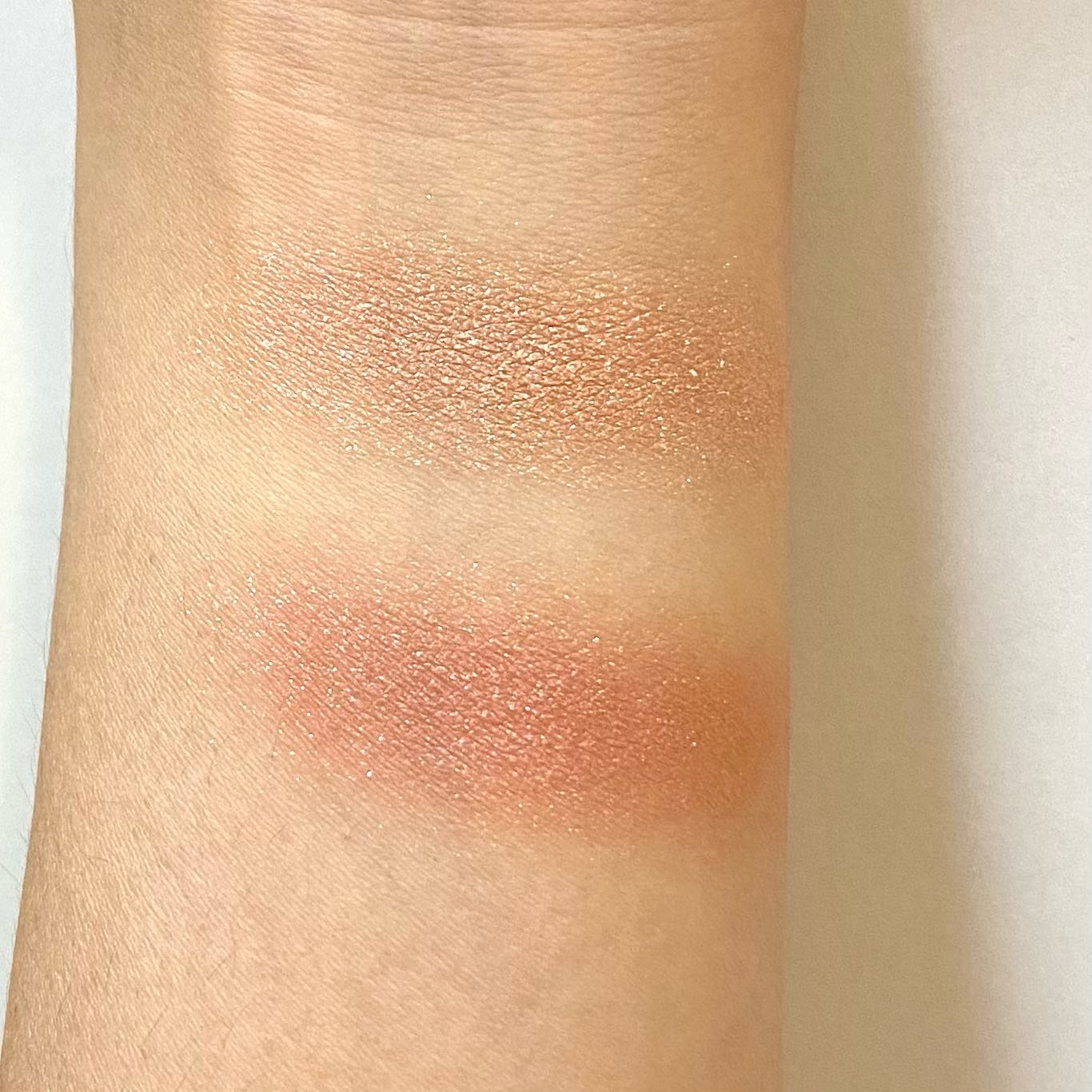 うん、やっぱ可愛い!♡ 神配色👏🏻 今の時期より夏に登場頻度増えそう🙌 ギラギラゴールドがタイプすぎる♡ 左:イエローゴールドシマー ⇒コッパーとゴールドのラメがたっぷり! 大粒ラメがギラギラ夏っぽい 右:シマリングライトピーチ ⇒発色は薄いもののベースや涙袋にだ活躍してくれる ピンクベージュ 左:オレンジ&ゴールデンシマー ⇒ありそうでなかったオレンジカラー オレンジからのゴールドの偏光がたまらない🍊 右:マットパープルレッド ⇒かなり濃いめのパープル!オレンジメイクにアクセントと深みを出してくれる