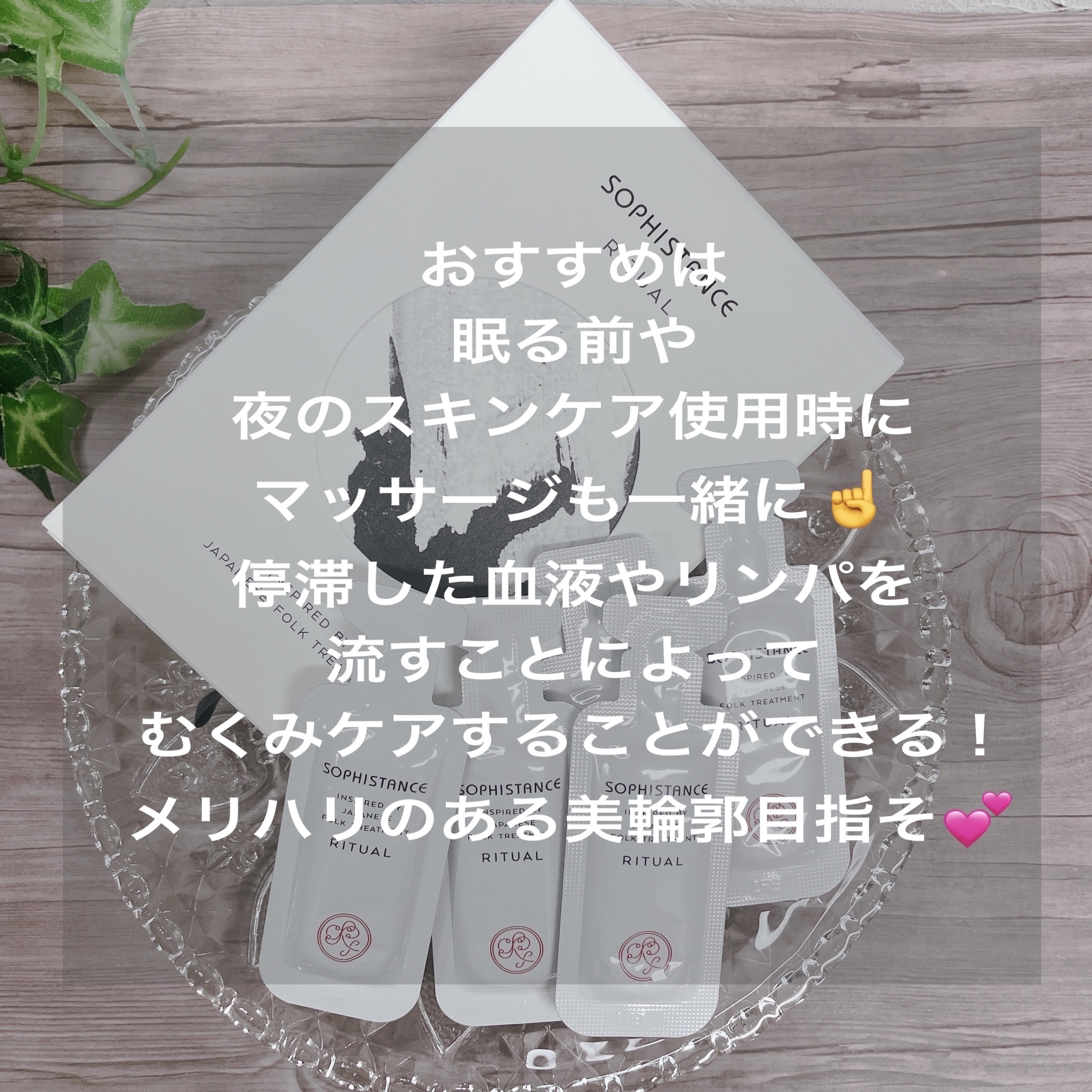 ・美活菌®発酵液※(コメヌカ発酵液)、ユズ種子エキス・ユズ果実エキス※(保湿成分)、ナギイカダ根エキス※(皮膚コンディショニング剤)が配合されていて肌にうるおいを与え、肌をひきしめてくれるよ。マッサージをして老廃物を定期的に流すことでむくみにも良さそう⭐️ ・ペンタバイティン※(異性化糖)、ビタミンC・ビタミンE※(整肌成分)、セラミド※(セラミドNP、AP、NG)を配合していて、肌のキメを整えてツヤを与えてくれるよ。 リッチなコクのある重ためのテクスチャー。伸びも良くて、寝る前にソフィスタンス リチュアルを使ってマッサージをすると気持ちが良かった︎👍🏻 3アイテムともオールシーズン使いやすそうなしっとりしてベタつきにくいテクスチャーだから朝夜問わずスキンケアできたよ☀🌙 柑橘系の心安らぐ香りが良かった🤤