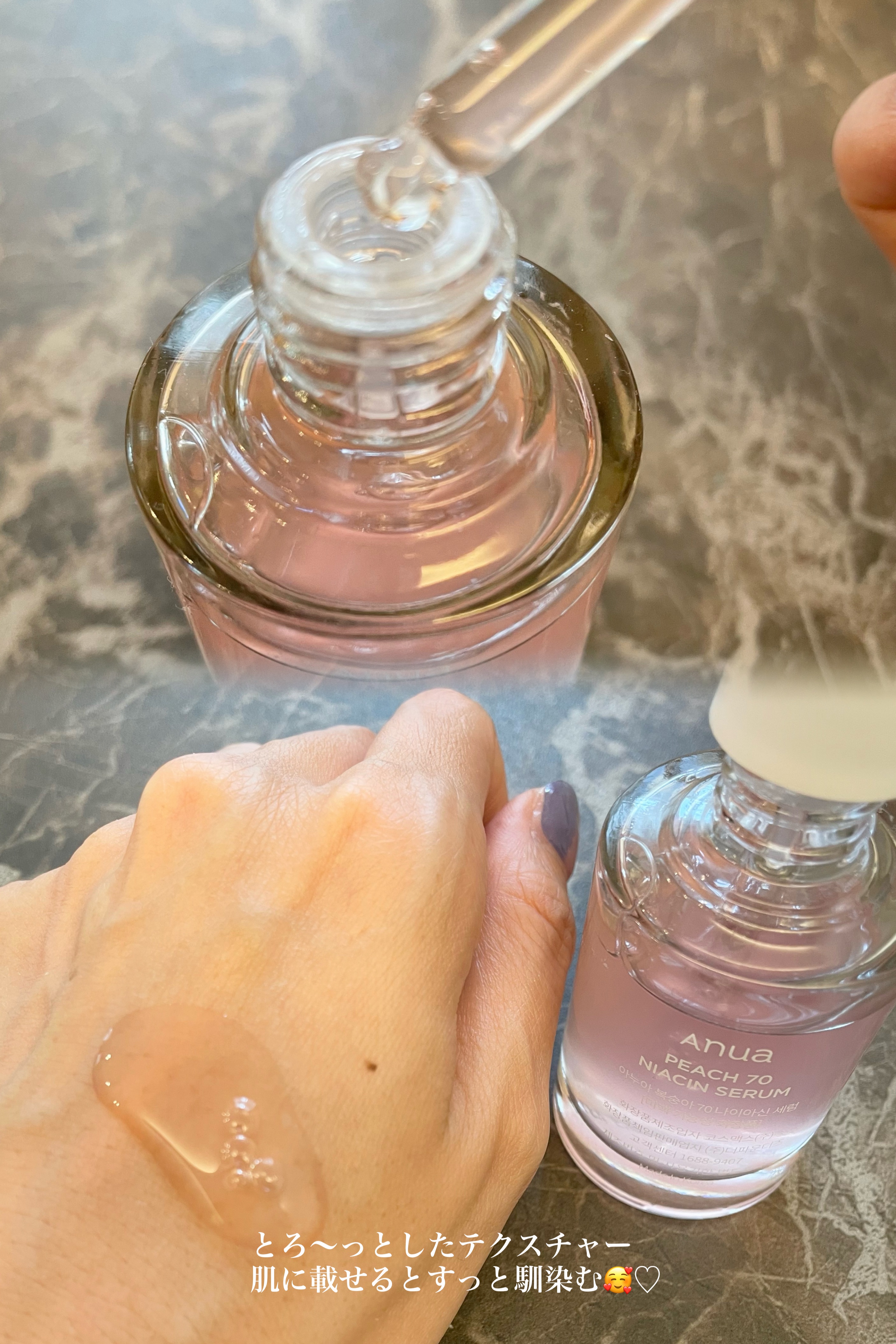 .Anua(アヌア)桃70%ナイアシンセラム30ml以前Anuaドクダミ80%水分沈静アンプルを試させていただいてリピートして愛用中なんですがなんと今回は2023年1月1日に新発売されているこちらを試させていただきました🍑「つるんと白桃肌を叶...