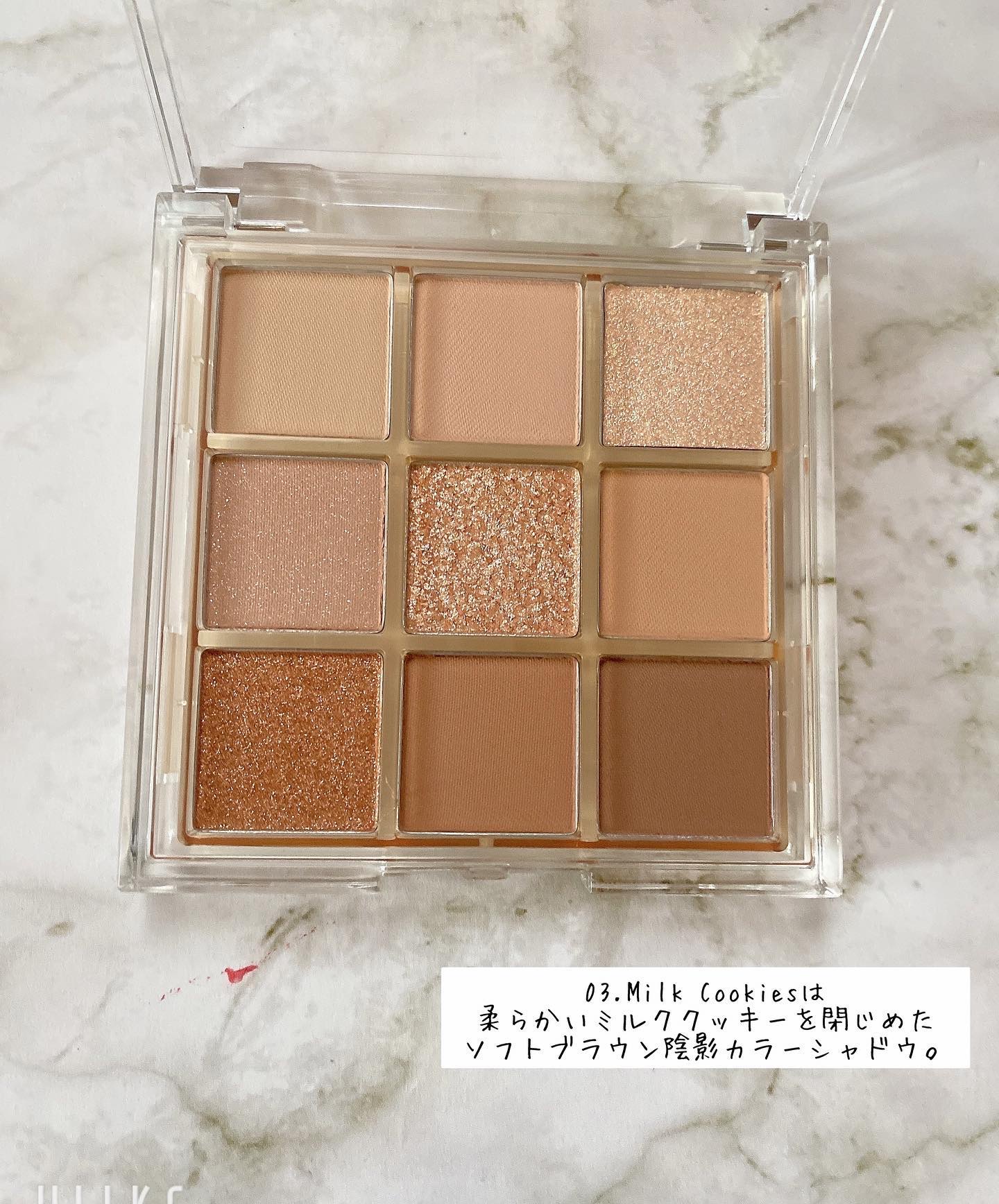 その日の雰囲気によって多彩に活用できる 9色のアイシャドウパレット✨ ミルククッキーのような柔らかいカラーを詰め込んだ、ソフトブラウン陰影カラーシャドウです。 肌なじみの良いカラーがセットされているのでどの肌トーンにも◎ ラメカラーもギラギラせず繊細でキレイです。