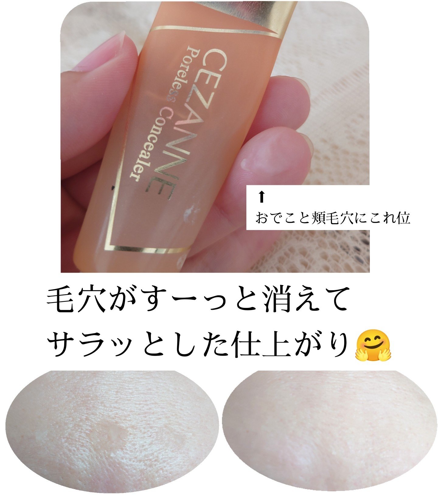 セザンヌの毛穴レスコンシーラーです♪硬めのテクスチャーで、毛穴の凸凹をフラットにしてくれます。塗った後はサラサラです。この後に下地やファンデーションを重ねますが、いつもより綺麗に仕上がりました☺️皮脂吸着パウダー配合なので、マスクをつけて過ご...