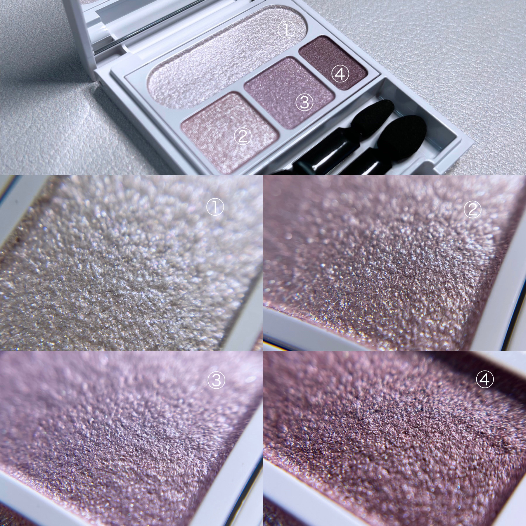キラめきを仕込む色と光のWグラデーション。 順番に塗るだけでプロ級の美しい陰影が簡単に作れる、 4色セットのアイカラーパレット。 4色のトーンをそろえているから、ぼかし込まなくても抜群のなじみやすさを発揮。 “なんとなく”順に重ねるだけで、簡単にキレイな最旬グラデーションが作れます。 最初にのせるクリームベースに一番多くパールを配合しており、 順々にパールの量を減らすことで、 ふんわりと上質な光沢感で洗練された目元に仕上がります。 全体的に優しい配色なので、 使いやすいパープル系アイシャドウパレットだと思います🎨 パール感も上品で程よく、チラチラと輝いて可愛いです✨ お仕事やデイリーメイクにも取り入れやすいと思いました💡 粉質はややしっとりめで、粉っぽくならないのが◎ 柔らかくて透明感のある仕上がりで、 顔色がぱっと明るく見えるのも嬉しいです☺️💕 個人的にブルベ夏さんは特に使いやすいパレットではないかな?と思います🎐