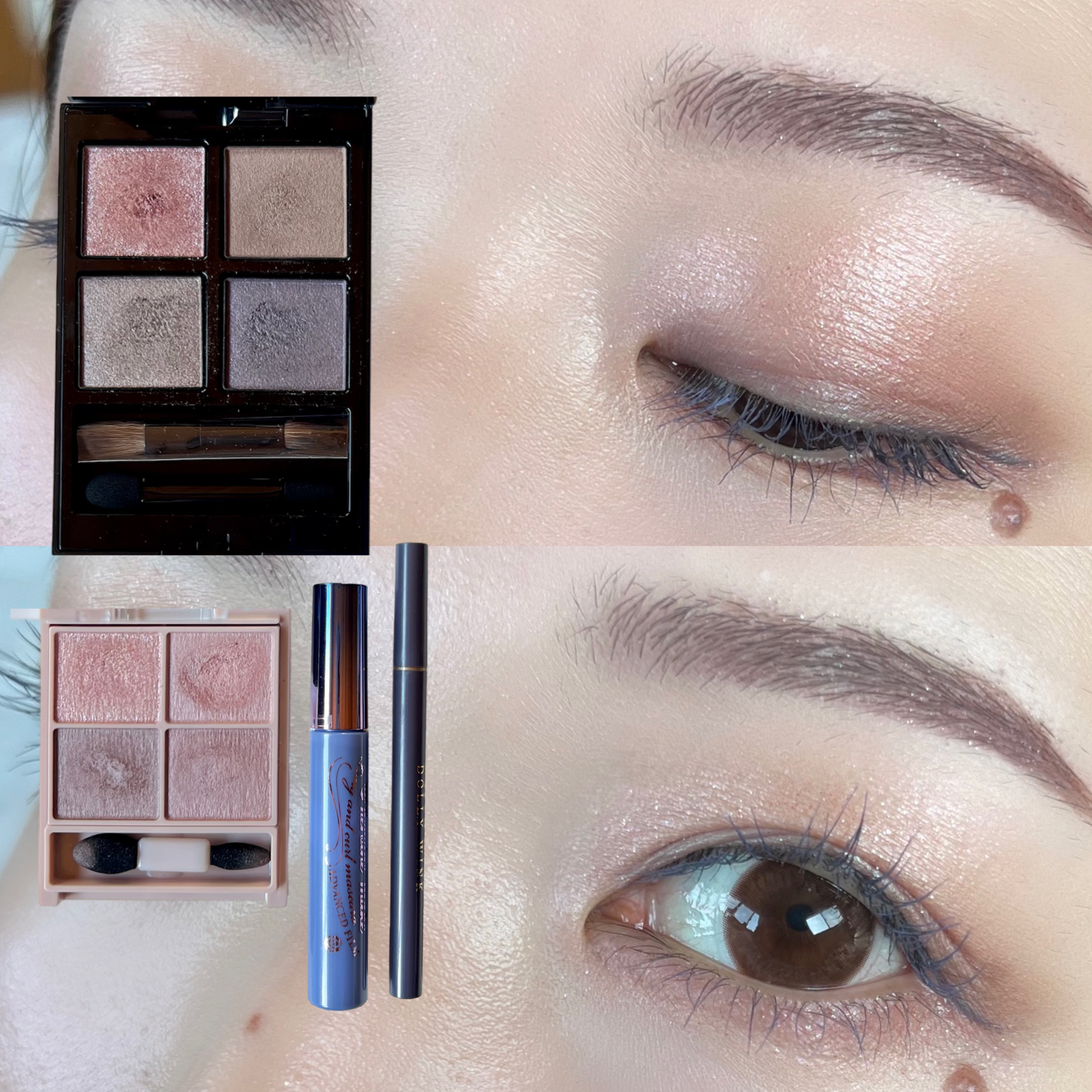 手に試した感じではベースのブルーは弱く、ラメ自体がブルーで可愛すぎる…! BAさんはパウダーアイシャドウのベースにもおすすめと教えてくれたので、 今日はこちらをベースにピンクブラウン系の アイシャドウを使ってメイクしてみたよ🫶🏻 肌に伸ばすとすぐにサラサラになるから ベタベタが残ったりしないし、 パウダーアイシャドウの上に重ねてもヨレない◎