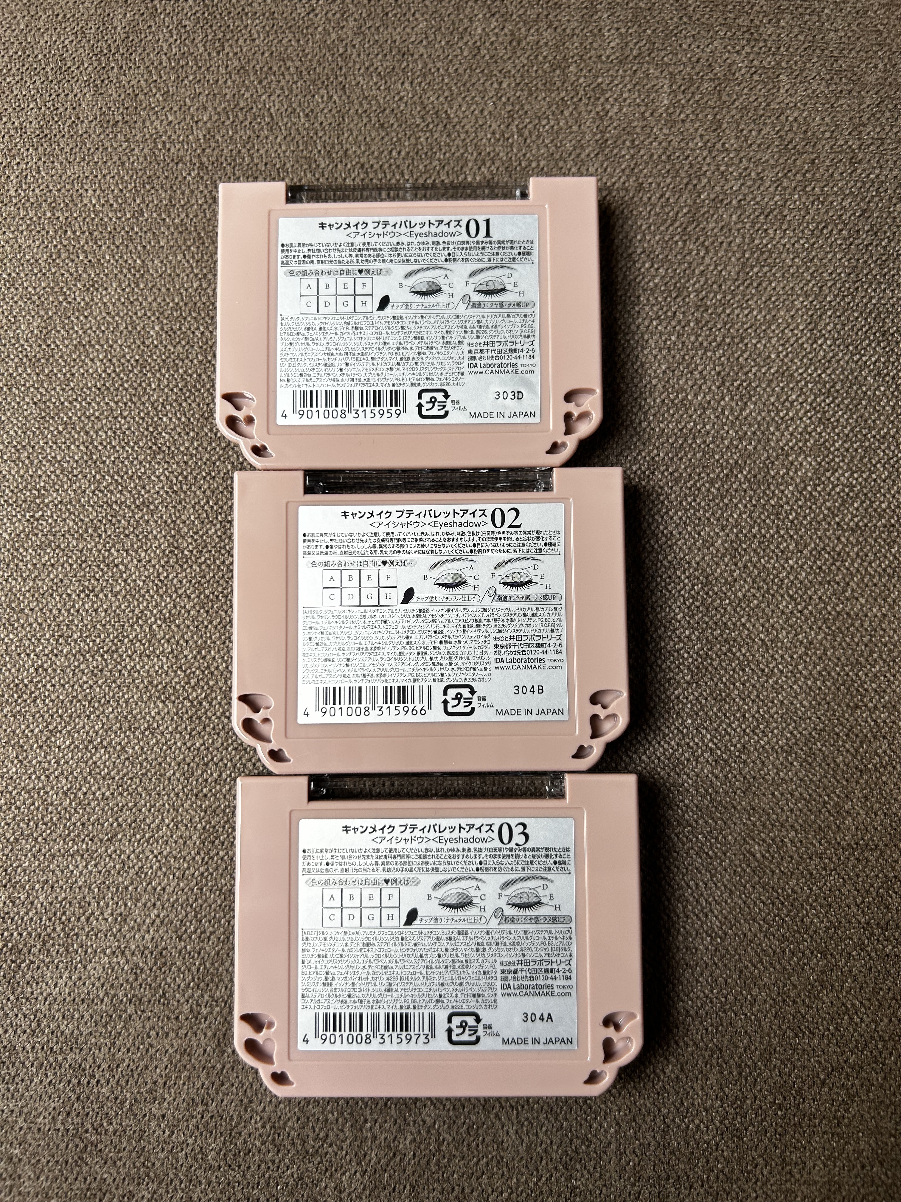 キャンメイク♡♡♡プティパレットアイズ01プリュムフラワー明るめのコーラルカラー🍊02ボヌールマロン 誰でも使いやすいピンクブラウン🐻03ミニョンヌリボン青みたっぷりピンク💓04アマンドブリュレ黄みが強めの濃いめブラウン🌼01プリュムフラワー...