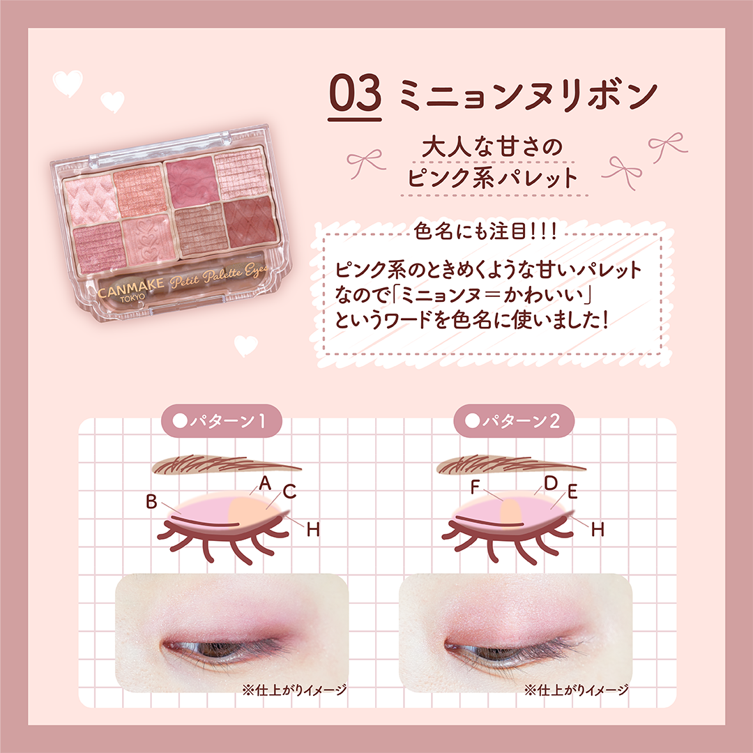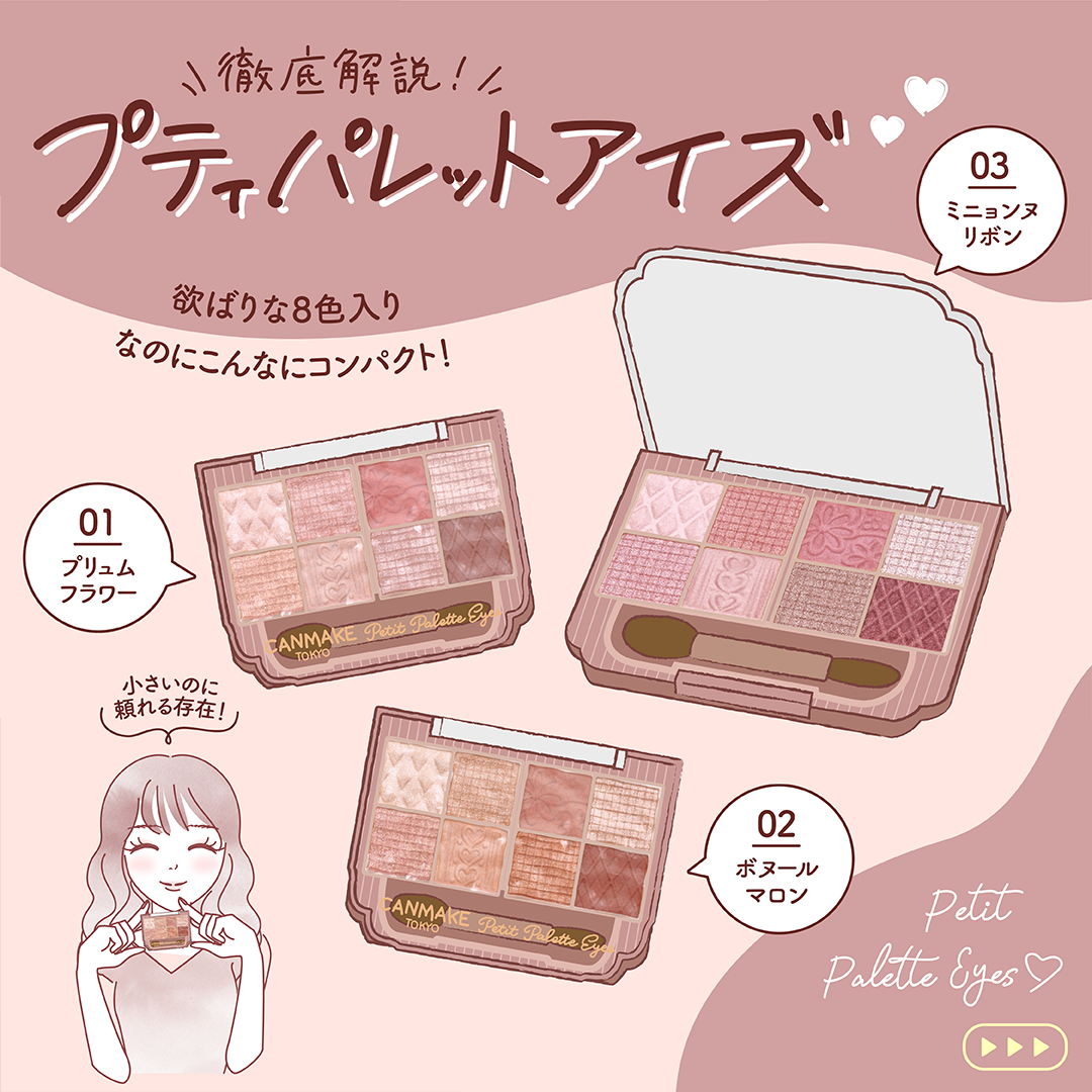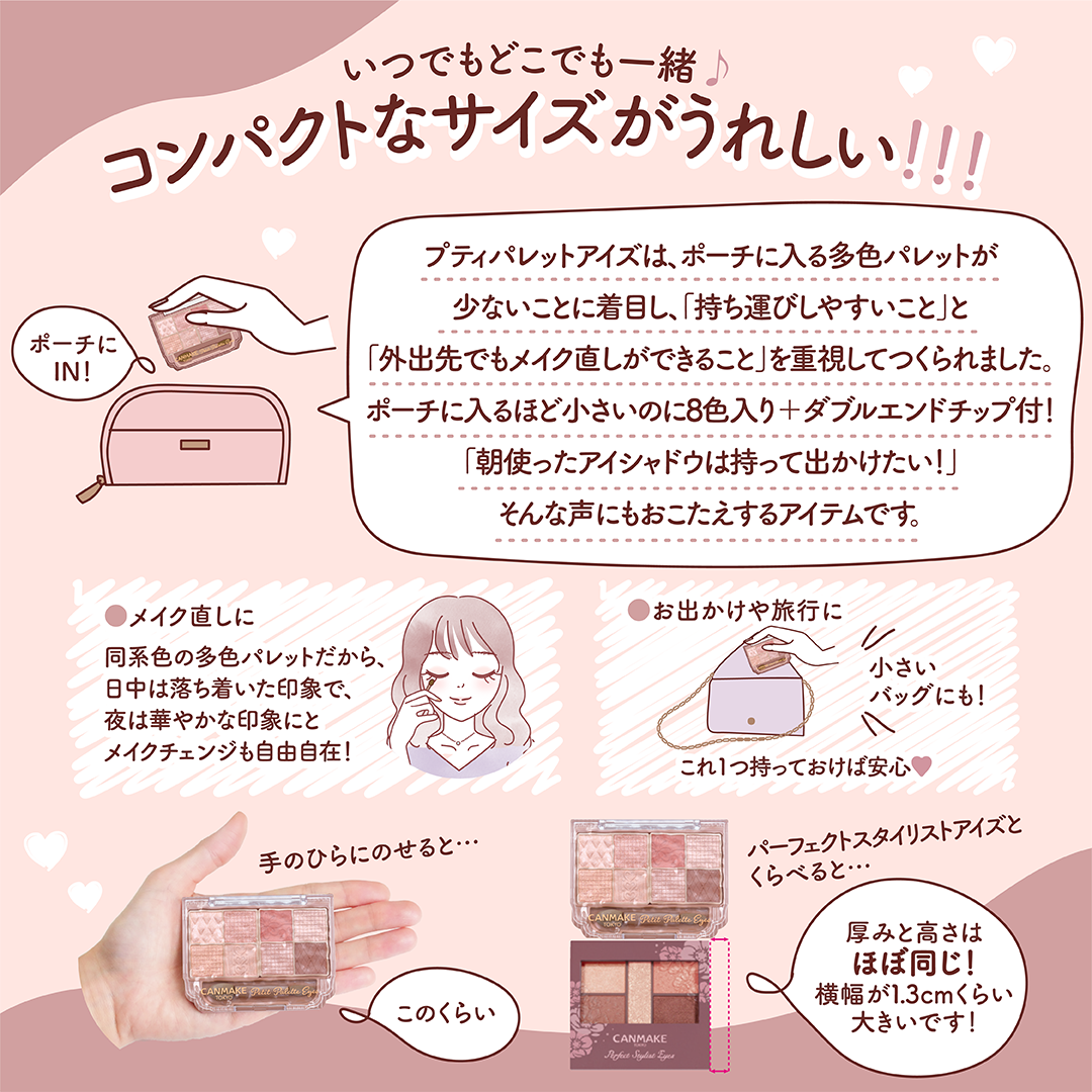 - 持ち歩ける多色パレットがキャンメイクから登場! 捨て色なしの8色入り&チップ付! 「持ち歩けること」や「外出先でもメイク直しができること」を重視した多色パレット。 持ち運びやすいサイズ感なのに、贅沢に8色入りです。 さらに便利なダブルエンドチップまで! マット×パール×ラメなど、組み合わせ方はあなたの自由! 自分好みのアイメイクを楽しめます。