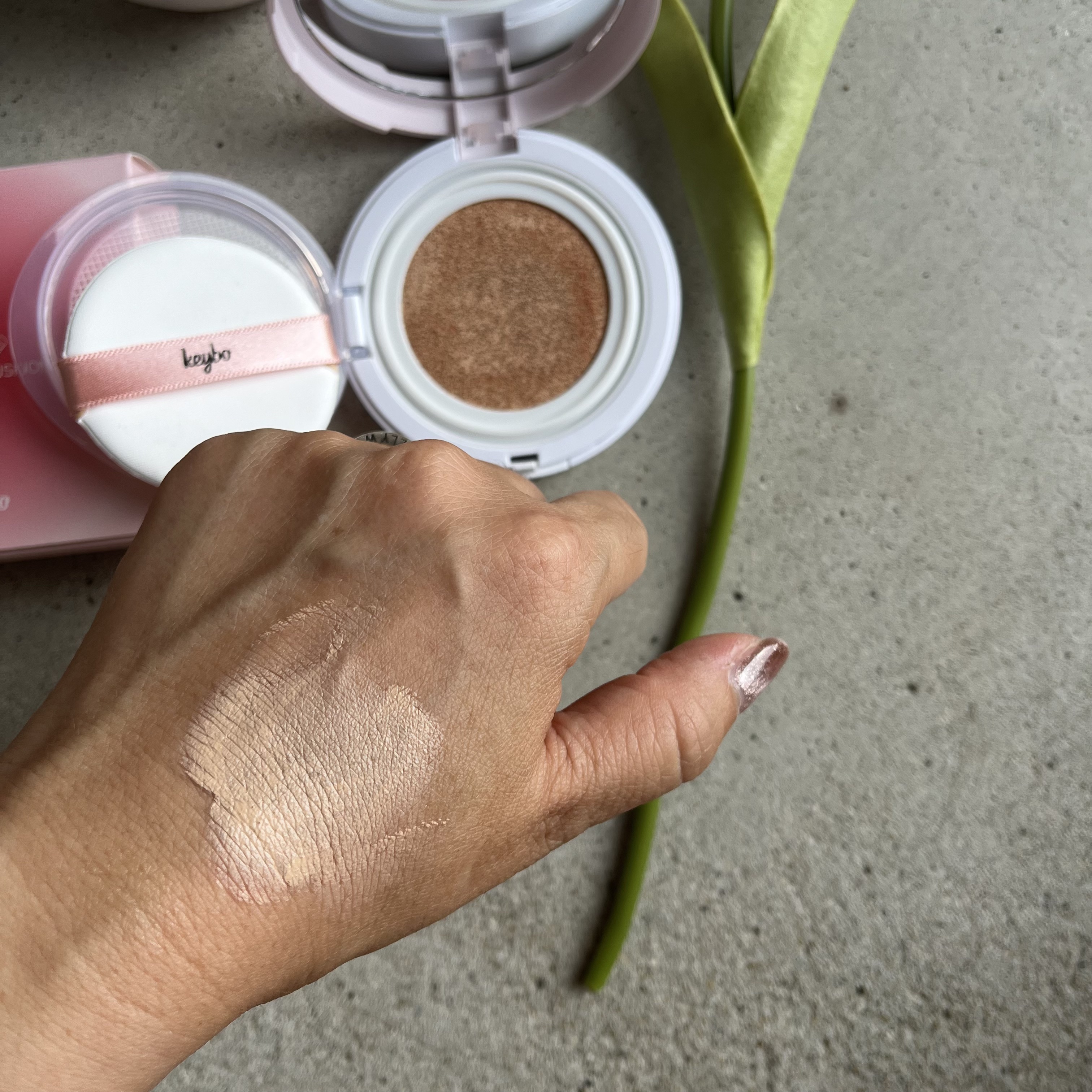 くすみや赤みをカバーしてくれて崩れにくい 保湿成分ヒアルロン酸・コラーゲン・ダマスクローズ水配合で冬でもしっとり使用感 肌にピタッと密着する感じで、くすみや、赤み、毛穴をカバーしてくれたよ🙌塗り広げるとまるで自分の肌が綺麗になったかのような自然な仕上がり😳✨ セミマットで自然な艶感がだせるクッションファンデだった👍💞