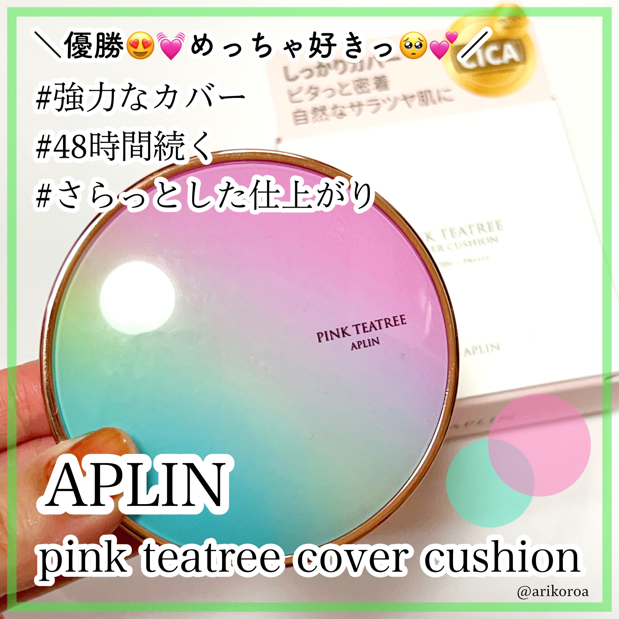 APLIN ピンクティーツリーカバークッション 21号ライトベージュ 2,490円(税込) 少量でよく伸びてハイカバー! 赤みやくすみをしっかりカバ一できるのに、厚塗り感のないなめらかな仕上がり♡ ハイカバーなのにナチュラルなツヤ感とサラッとしつつ、乾燥崩れしにくい仕上がりに感動します!!