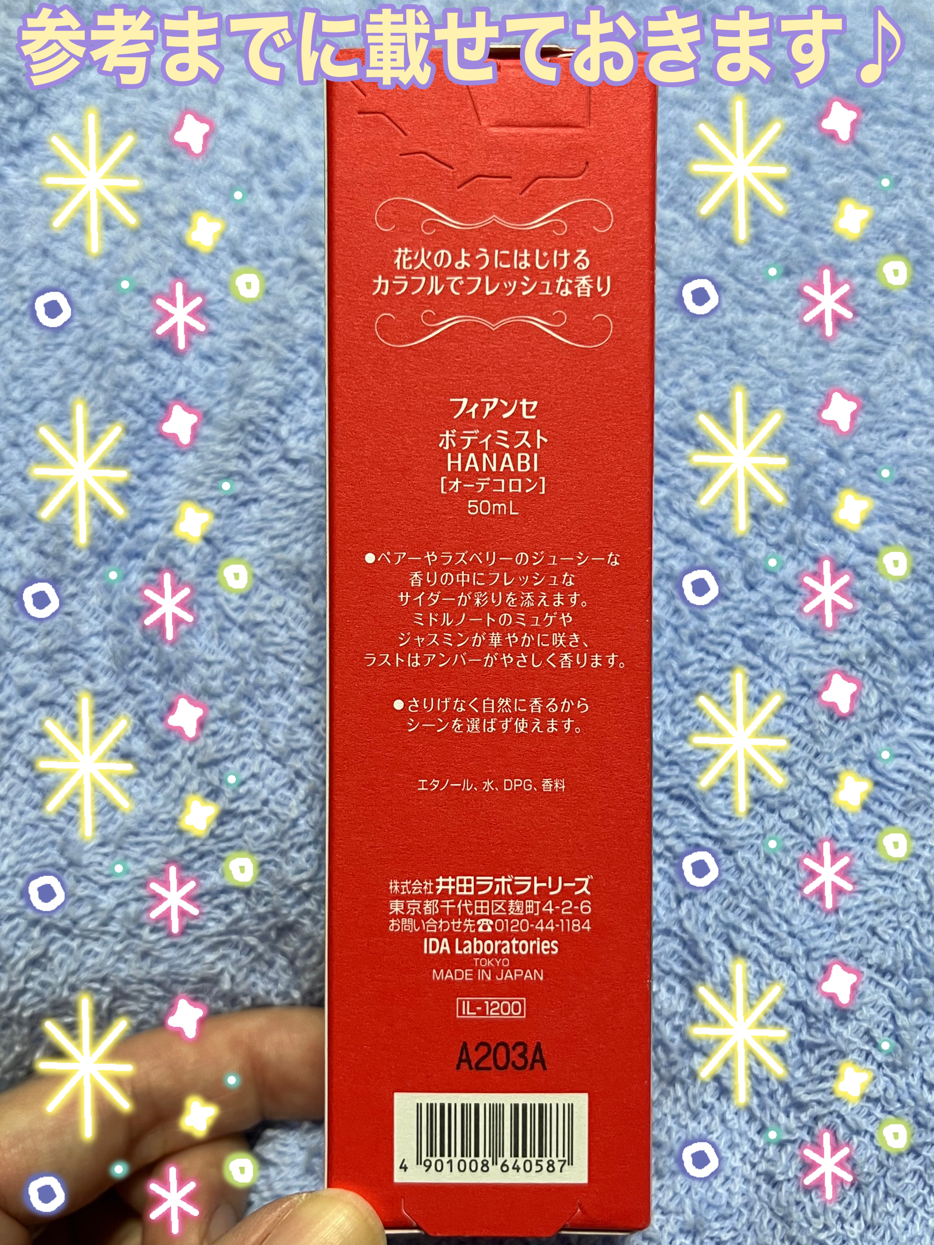 花火の香りが気になりすぎたポケモン。⟡˖·フィアンセ⟡˖·ボディミストHANABI近所のイオンで捕獲。1,320円でした。フレグランスで有名なフィアンセさん𓈒𓏸こちらのHANABIは毎年発売されてる数量限定アイテム.ᐟはじける甘さと爽やかさが...